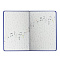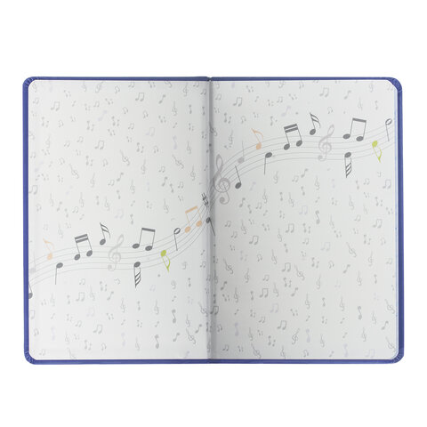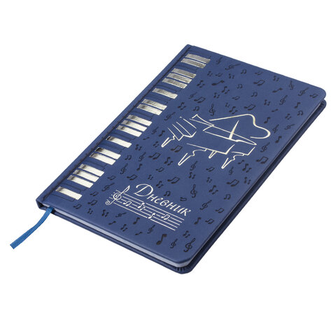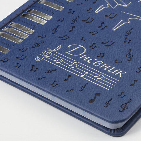 Внутренний блок изготовлен из белой офсетной бумаги повышенной плотности 70 г/м2. Содержит 48 листов для ведения записей и справочной информацией - длительности нот, интервалы, знаки в тональностях, ключи и пр. Обложка выполнена в темно-синем цвете из экокожи - презентабельного и износоустойчивого материала. Элементы дизайна выполнены с помощью термотиснения и фольги. Для удобства использования дневник снабжен закладкой-ляссе.
