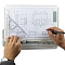 Доска размером 37х29,5 см изготовлена из пластика высокой прочности. Имеет антискользящие резиновые ножки, встроенный транспортир, две измерительные шкалы, дополнительный зажим для фиксации угла листа бумаги, подставки для размещения доски под наклоном, а также рейсшину. Оснащена двойным механизмом с блокировкой и пазом для фиксации рейсшины с любой из 4 сторон.