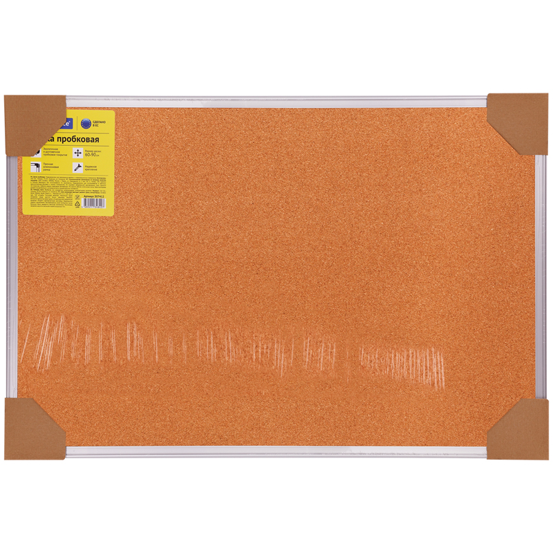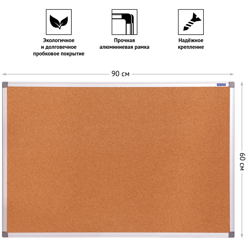 Пробковая доска предназначена для размещения заметок и информационных материалов с помощью силовых кнопок. Благодаря своей экологичности натуральное пробковое покрытие идеально как для общественных помещений, так и для дома. Алюминиевая рамка с укрепленными пластиковыми уголками гарантирует прочность конструкции и длительный срок службы. Предусмотрена возможность горизонтального и вертикального монтажа доски на поверхности. Комплектация - крепежные элементы, инструкция.