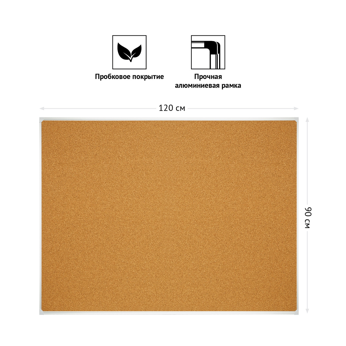 Доска пробковая OfficeSpace в размере 90*120 см предназначена для размещения заметок и информационных материалов с помощью силовых кнопок. Благодаря своей экологичности натуральное пробковое покрытие идеально как для общественных помещений, так и для дома. Алюминиевая рамка с укрепленными пластиковыми уголками гарантирует прочность конструкции и длительный срок службы. Предусмотрена возможность горизонтального и вертикального монтажа доски на поверхности. Комплектация - крепежные элементы, инструкция.<br/>• Покрытие рабочей поверхности: пробковое;<br/>• Размер: 90*120 см;<br/>• Тип крепления: закрытое.
