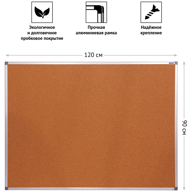 Пробковая доска предназначена для размещения заметок и информационных материалов с помощью силовых кнопок. Благодаря своей экологичности натуральное пробковое покрытие идеально как для общественных помещений, так и для дома. Алюминиевая рамка с укрепленными пластиковыми уголками гарантирует прочность конструкции и длительный срок службы. Предусмотрена возможность горизонтального и вертикального монтажа доски на поверхности. Комплектация - крепежные элементы, инструкция.