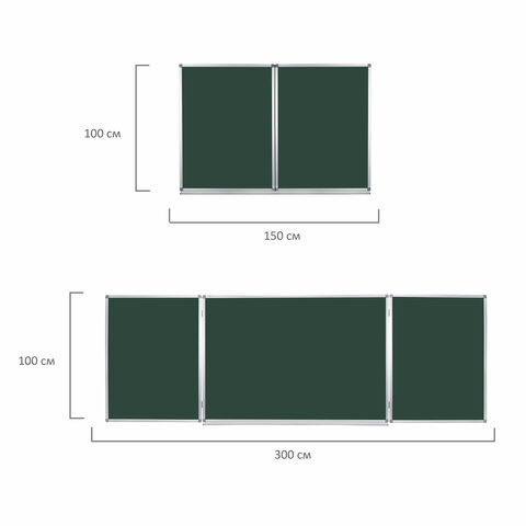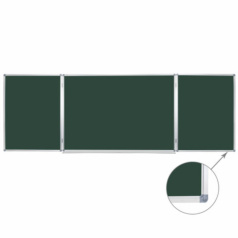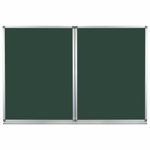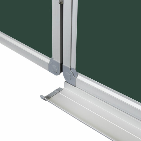Рабочие поверхности доски предназначены для письма и рисования мелками, а металлическая поверхность позволяет размещать информацию при помощи магнитов. Состоит из 3-х элементов: центральная односторонняя секция – 100х150 см, двусторонние боковые секции – каждая по 100х75 см. Элементы крепления и полка для принадлежностей входят в комплект. Цвет: зеленый.