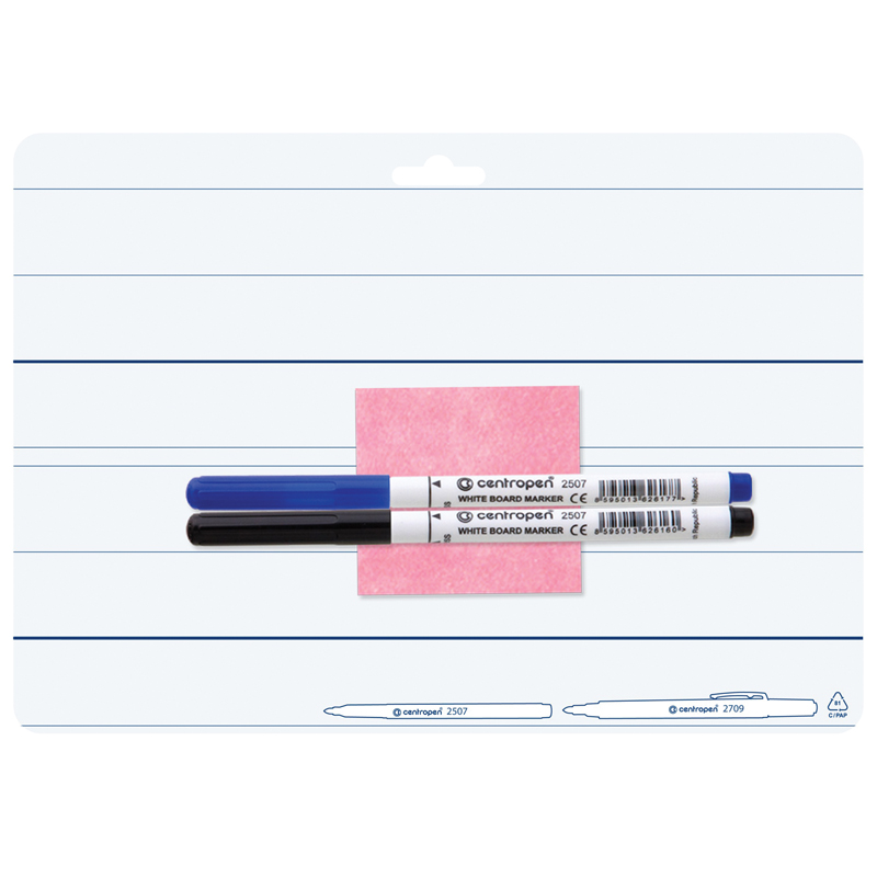 Двухсторонняя стираемая доска А4(297х210), с отверстием для подвешивания. Оборотная сторона расчерчена в линейку. В комплект входит два маркер арт. 2507 со стираемыми чернилами, и текстильная салфетка для стирания.