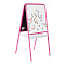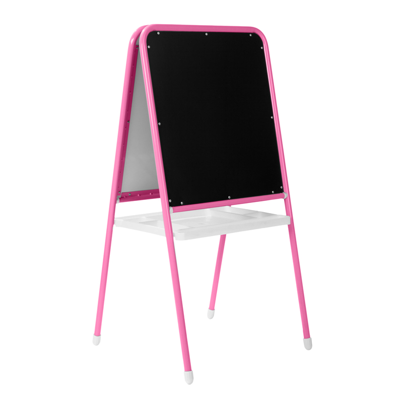 Мольберт имеет две поверхности для работы: одна специально предназначается для рисования мелом, вторая – маркерами. Обе стороны магнитные, что значительно расширяет функционал мольберта. В комплектацию входит только лоток под канцелярские принадлежности и магнитная азбука.