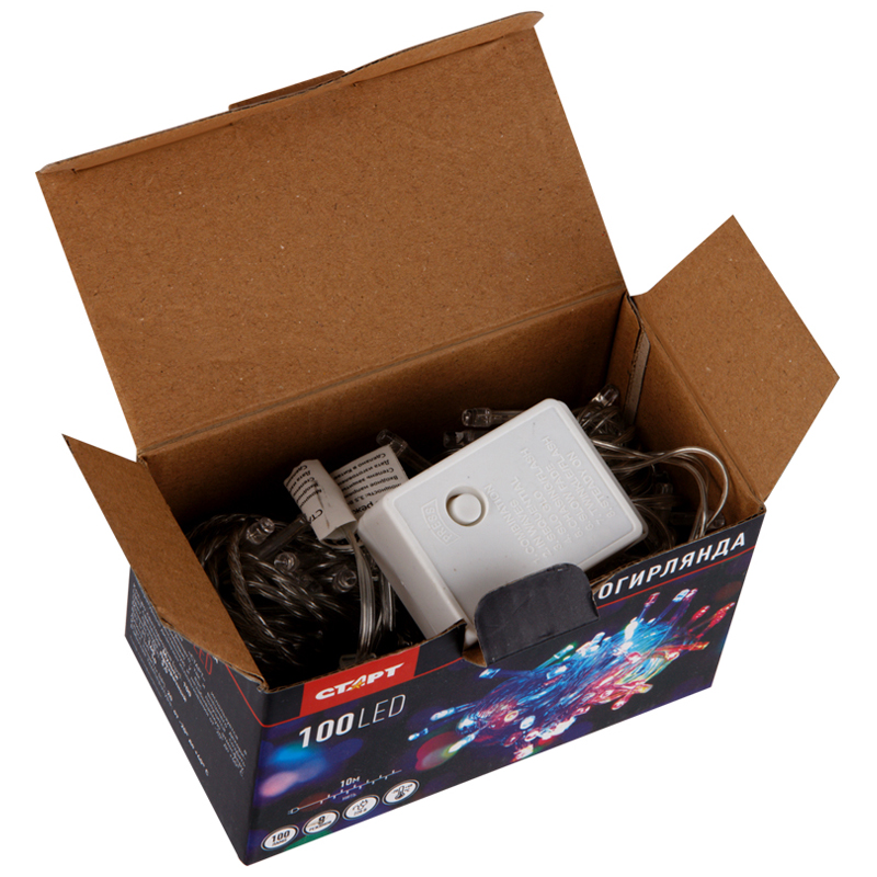 Светодиодная гирлянда СТАРТ поможет украсить помещение к Новому году, придаст ему праздничный вид и наполнит радостью и прекрасным настроением. С помощью длинной нити гирлянды можно декорировать не только интерьерные поверхности, но и оформлять объемные фигуры. <br/><br/>Дизайн и эстетика<br/>Новогодняя гирлянда имеет 100 светодиодов, которые размещены на проводе длиной 10 метров. Благодаря такой длине можно ярко оформить большое пространство, декорировать поверхности любой площади или создать свой декоративный орнамент из нити гирлянды. <br/>Встроенный контроллер позволяет подобрать один из восьми встроенных световых эффектов для создания праздничного или спокойного настроения. <br/>Использование светодиодов в качестве элементов освещения существенно экономит электроэнергию при длительном использовании. <br/><br/>Безопасность<br/>Питание гирлянды осуществляется от сети 220В. Благодаря встроенным контроллерам светодиоды защищены от перепадов напряжения и коротких замыканий. Светодиоды с минимальным энергопотреблением имеют низкий уровень нагрева. <br/>Материалы, используемые в гирлянде, отвечают экологическим нормам и не имеют токсичных веществ в составе. Благодаря низкому тепловыделению изделие безопасно для использования на окнах совместно с тканевыми занавесками.