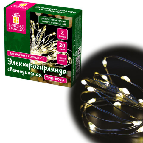 Электрогирлянда-нить комнатная "Роса" 2 м, 20 LED, теплый белый свет, на батарейках, ЗОЛОТАЯ СКАЗКА, 591931