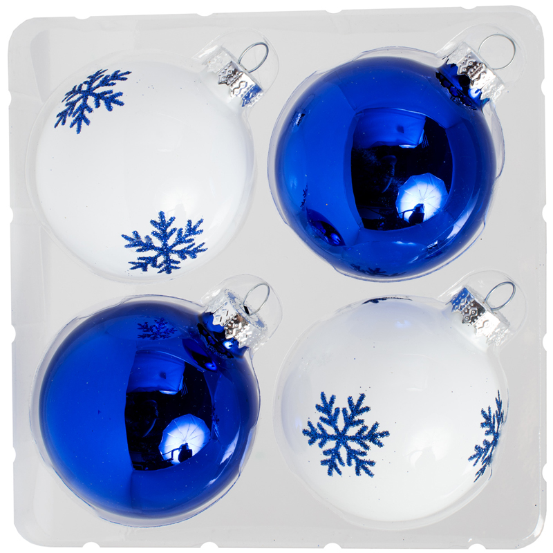 Новогоднее украшение отлично подойдет для декорации вашего дома и новогодней ели. С помощью специальной петельки украшение можно повесить в любом понравившемся вам месте. Но, конечно, удачнее всего оно будет смотреться на праздничной елке. Елочная игрушка – символ Нового года. Она несет в себе волшебство и красоту праздника. Такое украшение создаст в вашем доме атмосферу праздника, веселья и радости. В наборе 4 стеклянных шара синего и белого цвета со снежинкой.