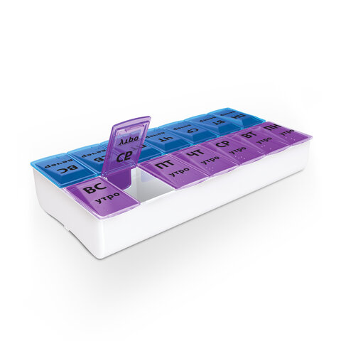 Таблетница представляет собой контейнер с 14 вместительными отделениями, промаркированными по дням недели и суточному режиму приема: утро, вечер. Для удобства крышки утренних и вечерних отсеков отличаются цветом.