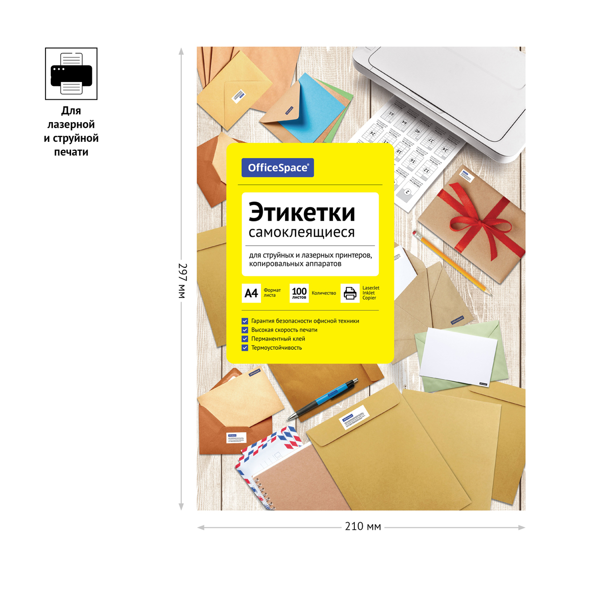 Этикетки самоклеящиеся OfficeSpace предназначены для многофункционального информационного этикетирования, например, адресные этикетки на конверты, ценники на товары, штрихкоды, информационные сообщения. В упаковке 100 листов формата А4 плотностью 70 г/м2, количество фрагментов – 24 (70*37 мм). Этикетки самоклеящиеся OfficeSpace и лазерных принтеров, копировальных аппаратов. Перед загрузкой в оргтехнику рекомендуется пролистывать бумагу с четырех сторон.