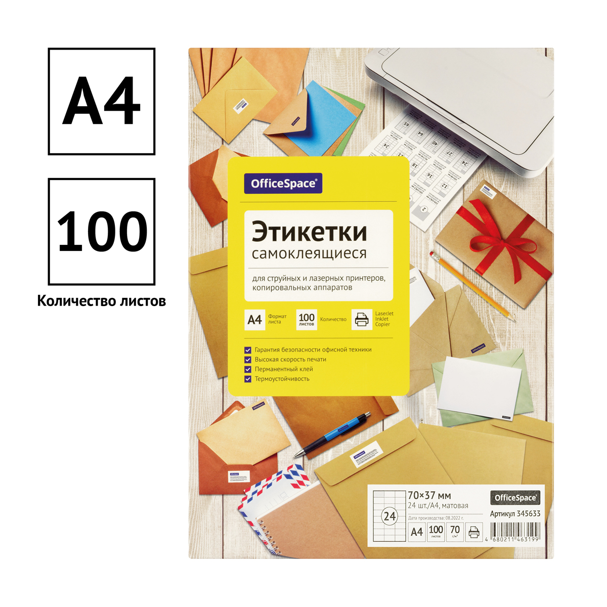 Этикетки самоклеящиеся OfficeSpace предназначены для многофункционального информационного этикетирования, например, адресные этикетки на конверты, ценники на товары, штрихкоды, информационные сообщения. В упаковке 100 листов формата А4 плотностью 70 г/м2, количество фрагментов – 24 (70*37 мм). Этикетки самоклеящиеся OfficeSpace и лазерных принтеров, копировальных аппаратов. Перед загрузкой в оргтехнику рекомендуется пролистывать бумагу с четырех сторон.<br/>• Формат: А4;<br/>• Количество фрагментов: 24 (70*37 мм);<br/>• Плотность: 70 г/м2;<br/>• Количество листов в упаковке: 100 штук;<br/>• Цвет: белый.