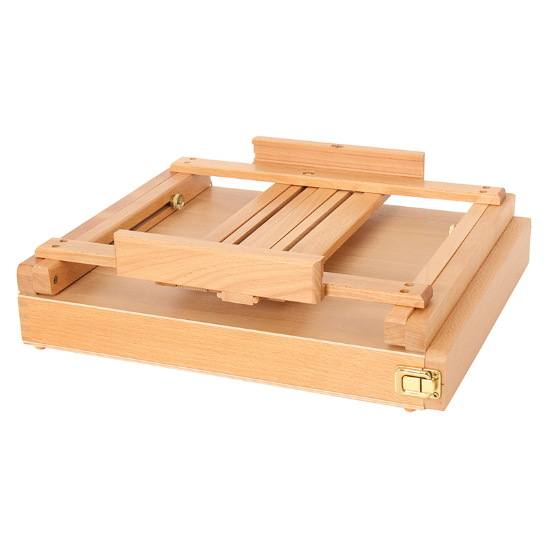 Этюдник имеет регулировку высоты верхнего фиксатора и нижней полки, которая позволяет работать с большими форматами сидя. Он складывается и снабжён ручкой для переноса, поэтому его удобно хранить и брать с собой. Изготовлен из лакированного бука.