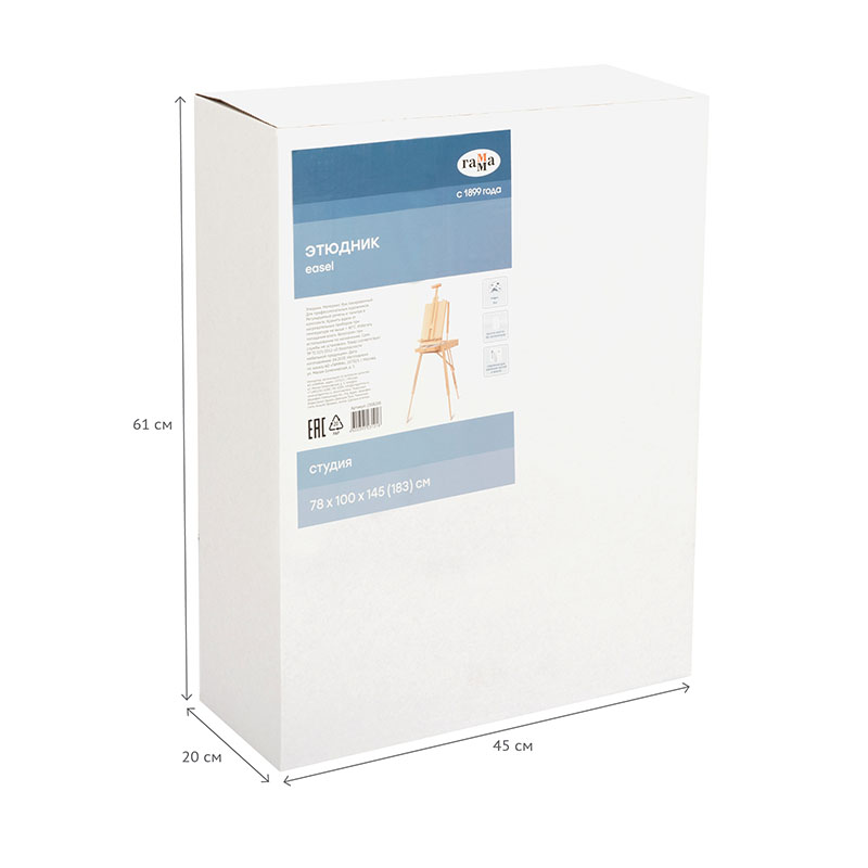 Напольный этюдник ГАММА «Студия» – оптимальная модель для работы в студии или на пленэре. Размер этюдника в сложенном состоянии – 78*100*145 см, максимальный размер холста – 86 см.
