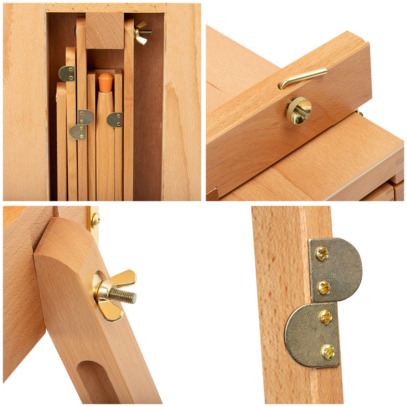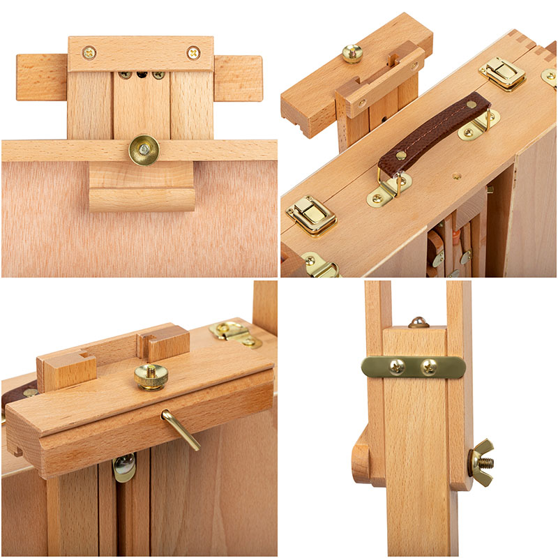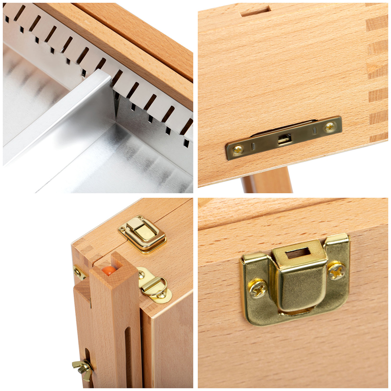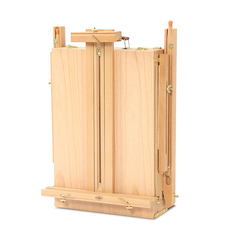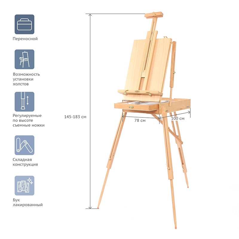 Этюдник оснащён выдвижным ящиком с металлической обивкой и модульной системой перегородок для хранения художественных материалов. Также в комплект входит палитра. Деревянные ножки регулируются по высоте, простая система крепления позволяет надёжно зафиксировать холст. Изготовлен из лакированного бука.