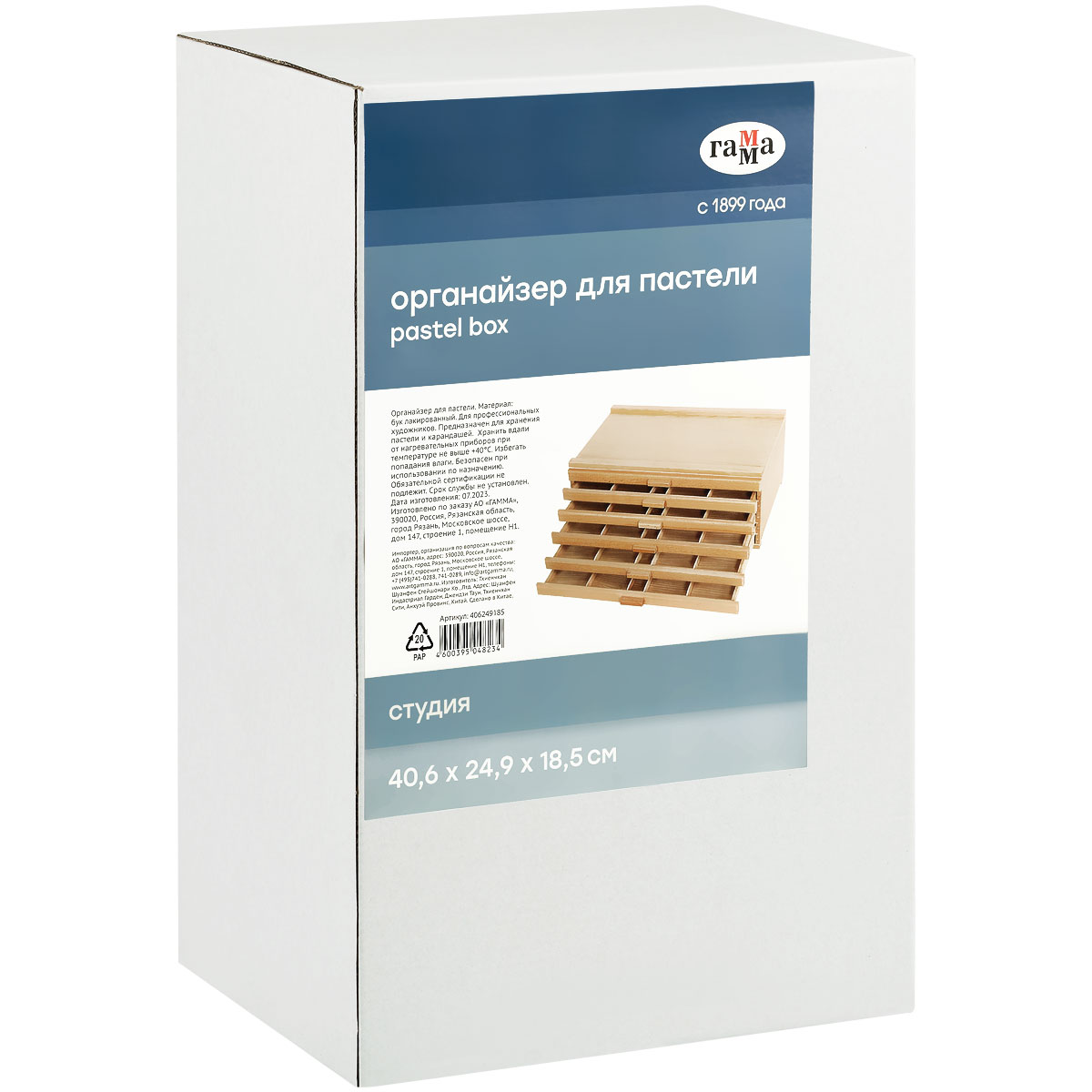 Органайзер ГАММА «Студия» предназначен для компактного хранения и переноски пастели и карандашей. Размер органайзера – 42*28*12,5(32,5) см. Сохраняет порядок на рабочем месте и не позволяет мелкам крошиться и осыпаться. Этюдник оснащён 6 выдвижными лотками с разделителями на зоны для сортировки мелков по типам и цветам. Изготовлен из лакированного бука. Его удобно переносить с собой и переставлять. Упакован в картонную коробку.