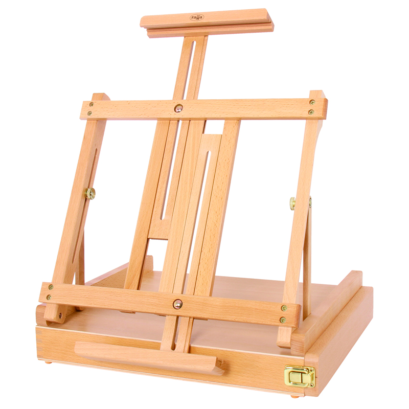 Настольный этюдник с выдвижным ящиком для художественных материалов. Регулировка высоты верхнего фиксатора и нижней полки позволяет работать с большими форматами сидя. Складывается, снабжен ручкой для переноса — удобно хранить и брать с собой.