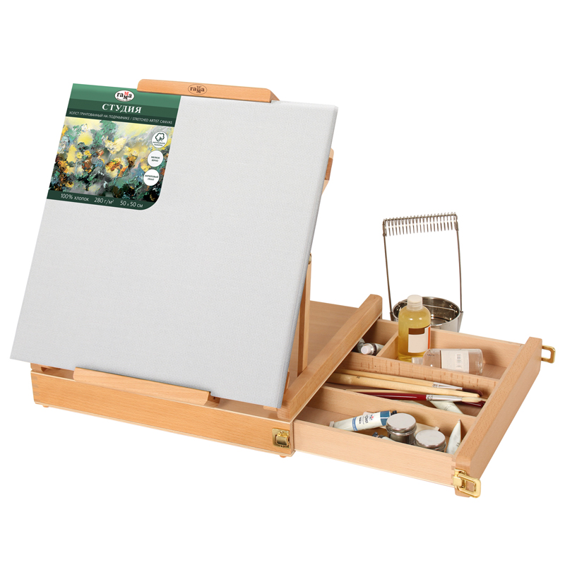 Настольный этюдник с выдвижным ящиком для художественных материалов. Регулировка высоты верхнего фиксатора и нижней полки позволяет работать с большими форматами сидя. Складывается, снабжен ручкой для переноса — удобно хранить и брать с собой.<br/>Материал — лакированный бук.<br/>Максимальный размер холста – 86 см.<br/><br/>Причина уценки: механические повреждения упаковки.
