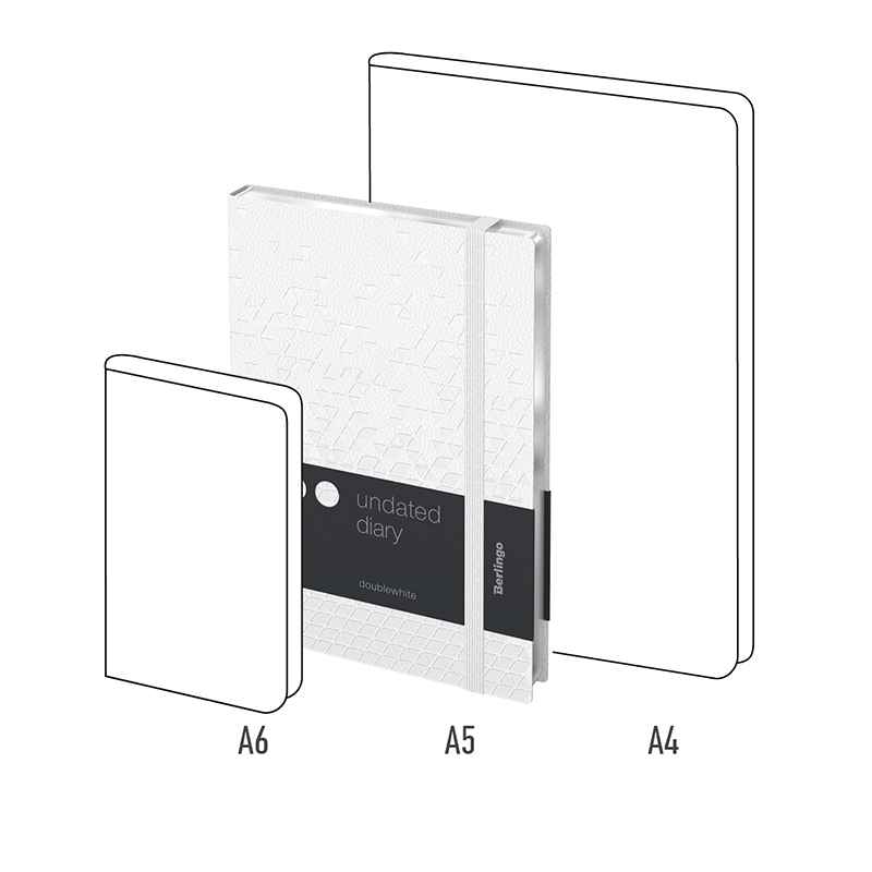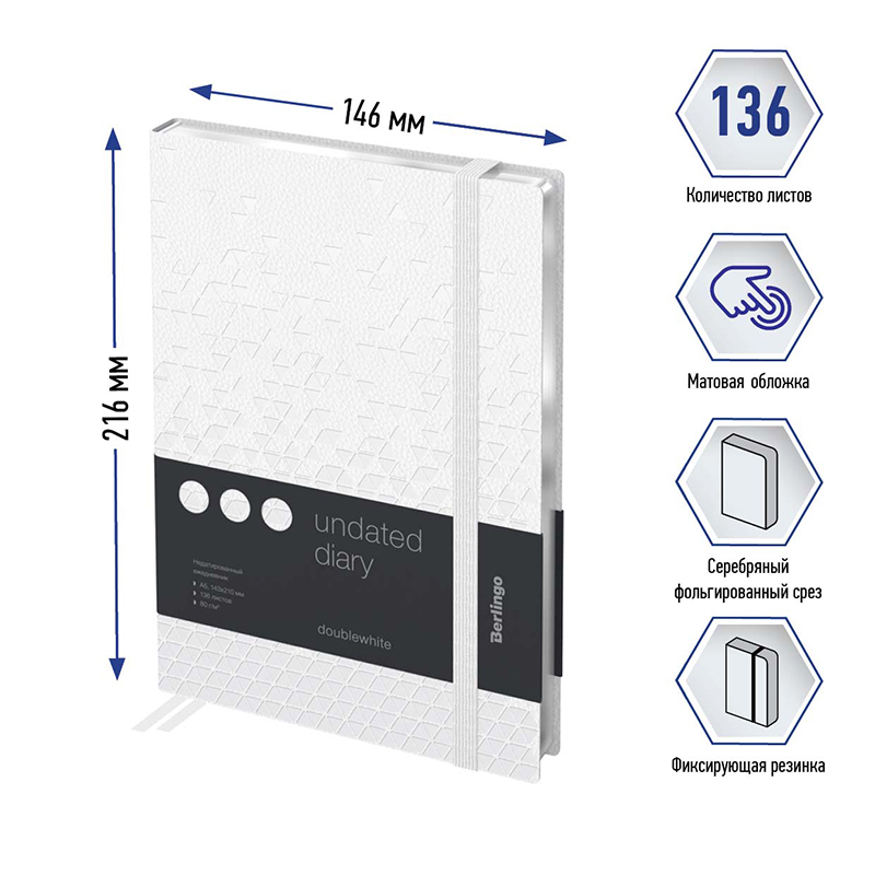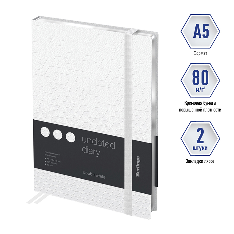 Недатированные ежедневники Berlingo ""DoubleWhite" в полужеской обложке из искусственной кожи белого цвета с имиджевым тиснением. Серебряный срез блока. Вертикальная фиксирующая резинка. Внутренний блок из 136 листов высококачественной кремовой бумаги повышенной плотности 80 г/м², пантонная печать в 2 краски, справочный материал и перфорированные уголки. Две закладки-ляссе. Отрывные заметки, бланки извещения о ДТП и справочные материалы. 3 комплекта стикеров станут приятным подарком. Внутренний карман на заднем форзаце для хранения записей и заметок. Индивидуальная упаковка. Подходят под персонализацию