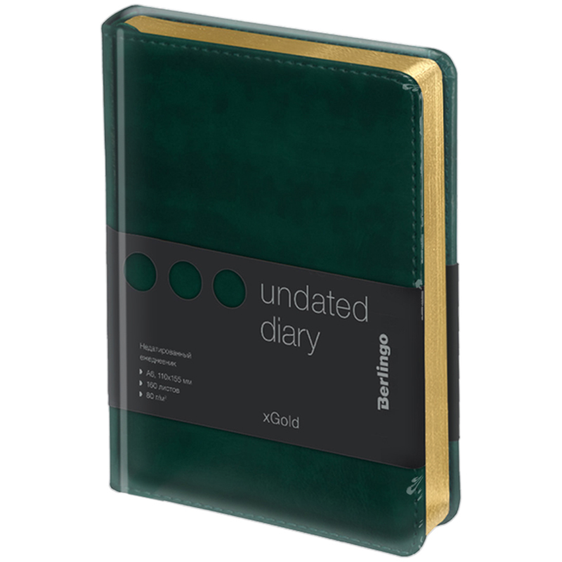 Компактный недатированный ежедневник Berlingo xGold формата А6 с твердой обложкой из экокожи и поролоновой прослойкой идеален для повседневного использования. Золотой фольгированный срез красиво подчеркивает насыщенный зеленый цвет обложки. Внутренний блок состоит из 160 листов высококачественной кремовой бумаги повышенной плотности 80 г/м² с пантонной печатью в 2 краски. Размер недатированного ежедневника – 110 на 155 мм.<br/>Перфорированные уголки листов и 2 закладки-ляссе сделают использование ежедневника Berlingo xGold комфортным. Ежедневник Berlingo подходит под персонализацию, а 3 комплекта стикеров станут приятным подарком. Внутри располагаются географическая карта, отрывные заметки, бланки извещения о ДТП и справочные материалы. <br/>• Формат: A6;<br/>• Размер: 110*155 мм;<br/>• Количество листов: 160;<br/>• Материал обложки: экокожа;<br/>• Цвет обложки: зеленый.