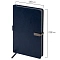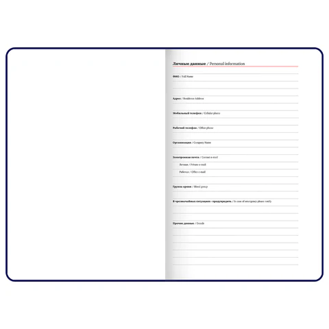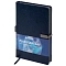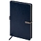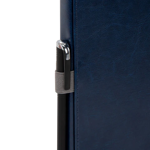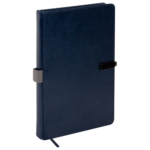 Твердая обложка стилизована под гладкую кожу синего цвета. Материал обложки подходит для горячего тиснения. Для удобства пользования ежедневник снабжен держателем для ручки, а также стильной магнитной застёжкой. Цветной срез в контраст обложки придает ежедневнику особый шарм. Дополнением является закладка-ляссе, с помощью которой при необходимости можно быстро открыть ежедневник на нужной странице. Ежедневник снабжен обширным справочным материалом. В конце есть 4 страницы для записей и заметок.