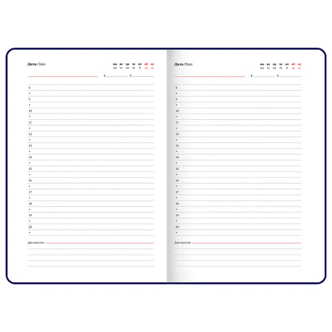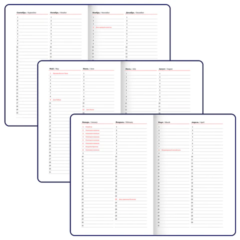 Внутренний блок включает 160 листов белой бумаги плотностью 70 г/м2. Каждая страничка имеет перфорированный угол. Благодаря стандартному формату А5 (148х218 мм) ежедневник удобно использовать как в офисе, так и на выездных деловых встречах.