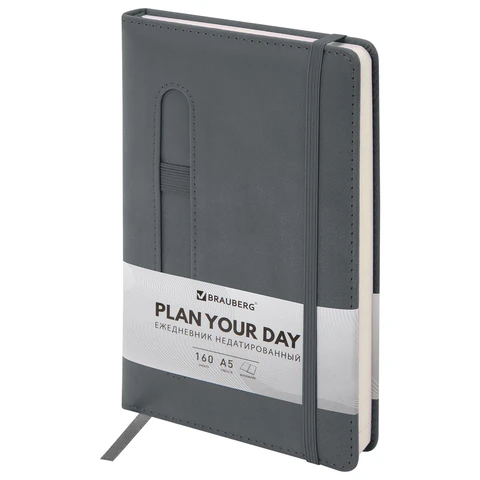 Ежедневник недатированный А5 148x218 мм BRAUBERG "Optimal", под кожу, 160 листов, резинка, держатель для ручки, серый, 118644