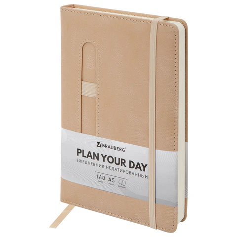 Ежедневник недатированный А5 148x218 мм BRAUBERG "Optimal", под кожу, 160 листов, резинка, держатель для ручки, бежевый, 118642