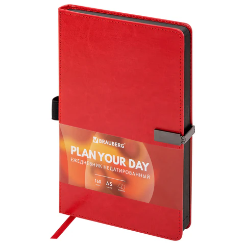 Ежедневник недатированный А5 148x218 мм BRAUBERG "Optimal", под кожу, 160 листов, резинка, держатель для ручки, красный, 118641