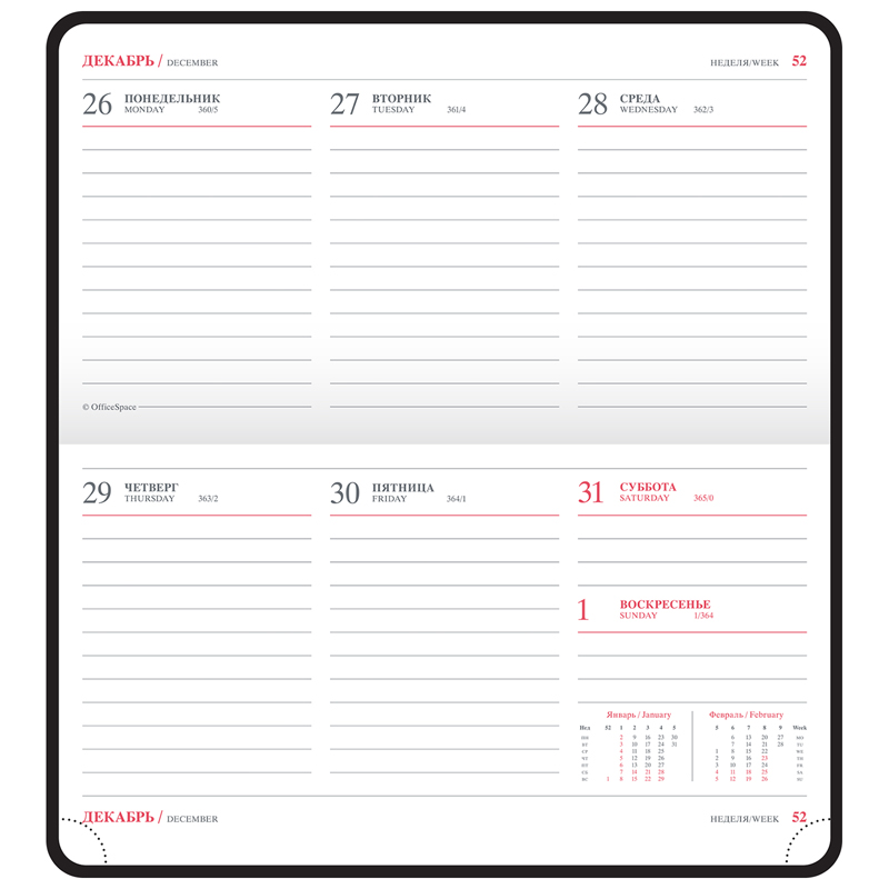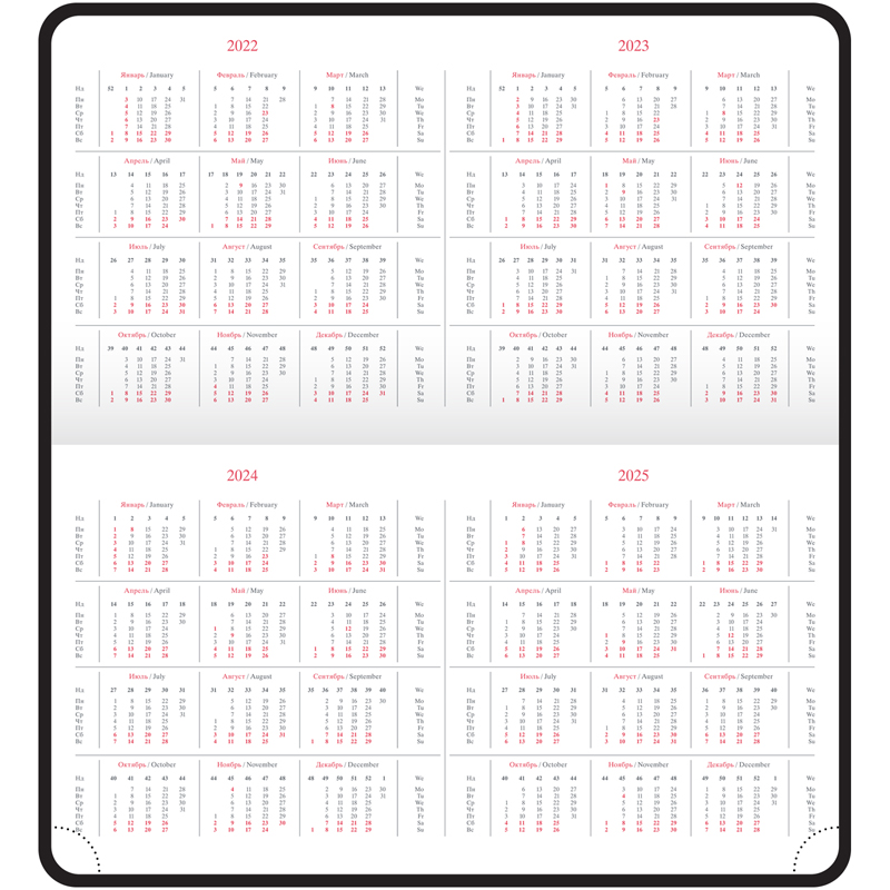 Перфорированные уголки и закладка-ляссе обеспечат комфорт и удобство при использовании еженедельника. Внутри есть полезный справочный материал. Еженедельник подходит под персонализацию. Поставляется в индивидуальной упаковке.