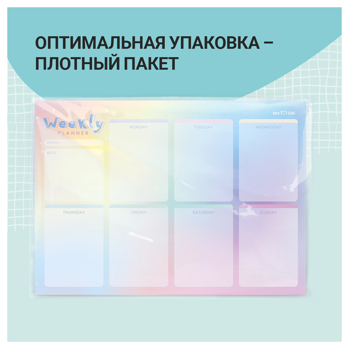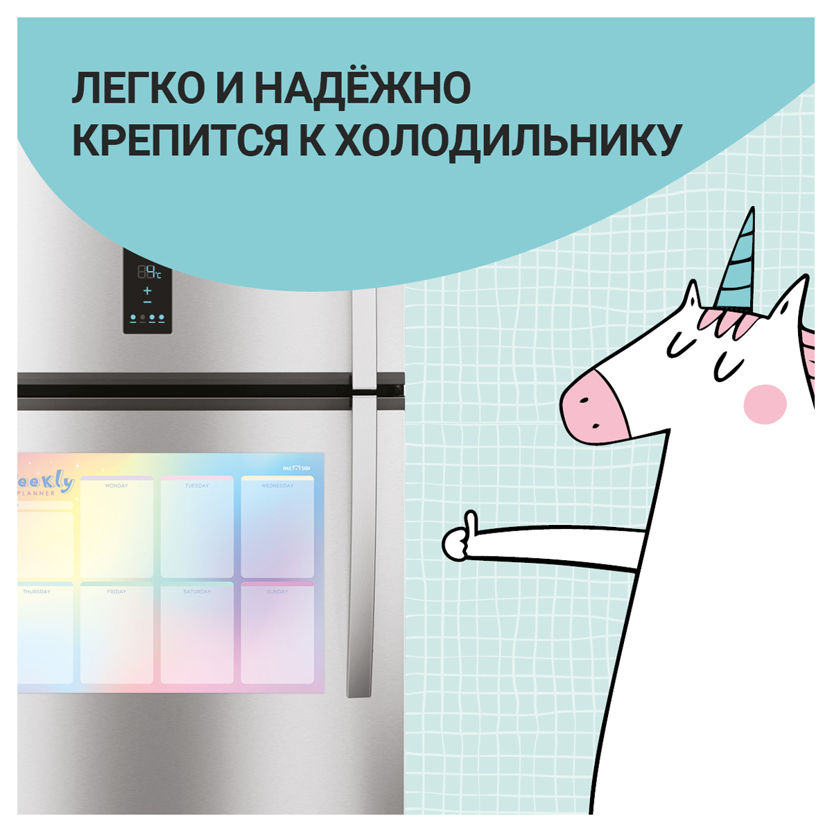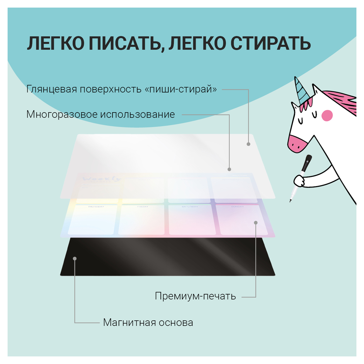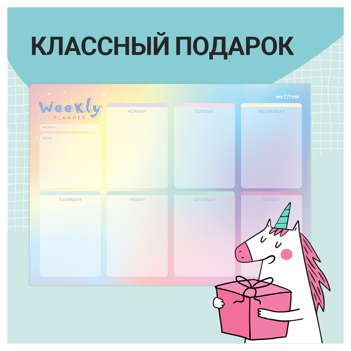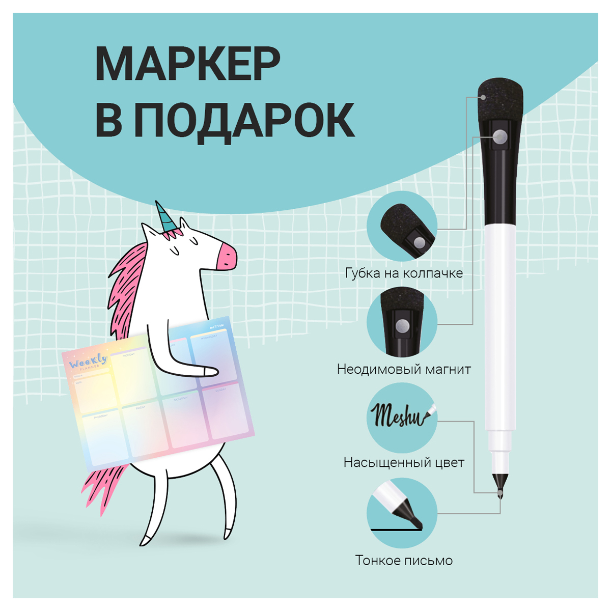 Магнитный планер на неделю MESHU Gradient – отличный помощник в планировании времени. Планер формата А4 выполнен из картона плотностью 200 г/м2, покрытого магнитным винилом. Ламинация позволяет многократно писать и стирать надписи. Размер магнитного расписания – 210*297 мм. В комплекте прилагается маркер на магните со стирателем, которым очень удобно корректировать записи и крепить его к любой металлической поверхности (например, к холодильнику). Внимание! Используйте только маркер на водной основе. Для очистки поверхности используйте влажную салфетку. Планер выполнен в оригинальном универсальном дизайне. Он поможет запомнить задачи, спланировать расписание и встречи с коллегами, друзьями или семьёй. <br/>Комплект упакован в индивидуальный пакет. <br/>• Формат: А4;<br/>• Размер: 210*297 мм;<br/>• Материал: картон, магнитный винил;<br/>• Плотность картона: 200 г/кв. м;<br/>• Пол: универсальный.