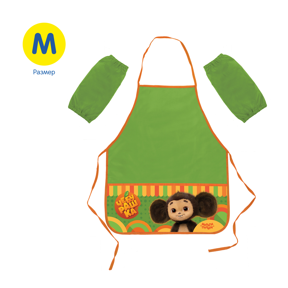 Удобный фартук «Мульти-Пульти» серии «Чебурашка» с ярким дизайном цветов для занятий трудом и творчеством. Водоотталкивающая ткань надежно защитит одежду ребенка от возможных загрязнений. Для детей старше трёх лет.<br/>• Нарукавники: да;<br/>• Цвет: зелёный.