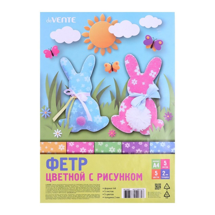Фетр цветной набор, толщина-2 мм, формат А4, мягкий, 8 листов, 8 цветов, яркие цвета