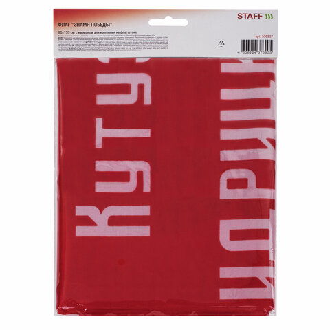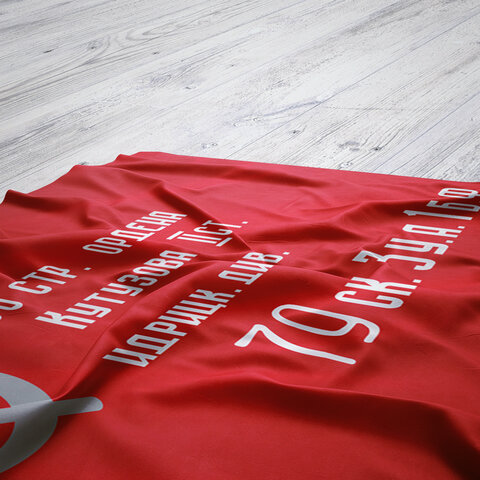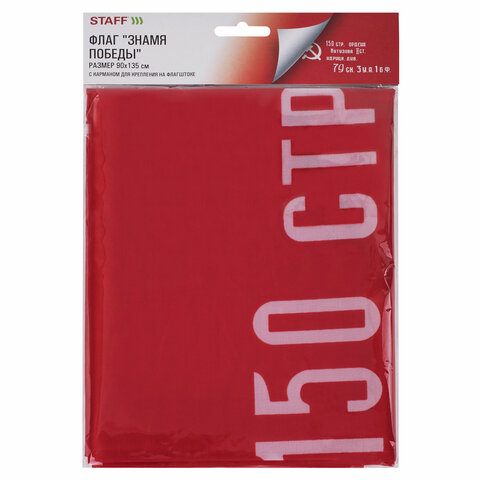 Флаг "Знамя Победы" представляет собой прямоугольное красное полотно, на лицевой стороне которого вверху изображены серебряные пятиконечная звезда, серп и молот, а на остальной части полотнища – надпись белыми буквами в четыре строки: «150 стр. ордена Кутузова II ст. идрицк. див. 79 С. К. 3 У. А. 1 Б. Ф.». Яркое изображение с двух сторон флага. Полотно флага оснащено карманом под флагшток, есть закрепляющие завязки снизу. Максимальный диаметр флагштока - 3 см. Флаг выполнен из плотного полиэстера. Размер - 90х135 см, плотность материала - 68 Ден. Флагшток не входит в комплект.
