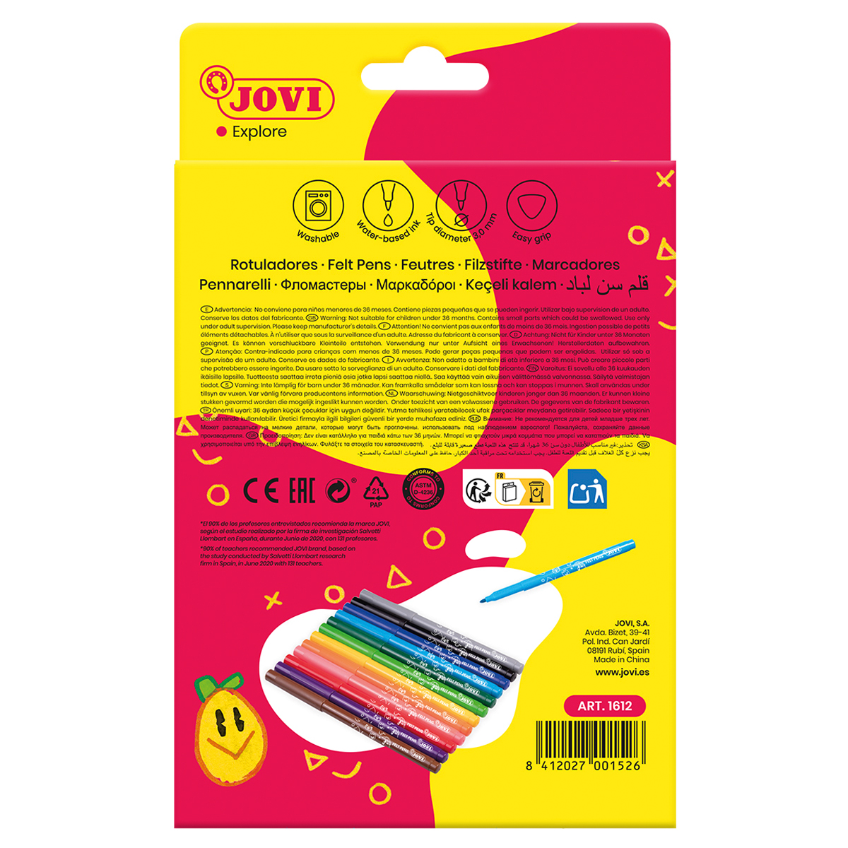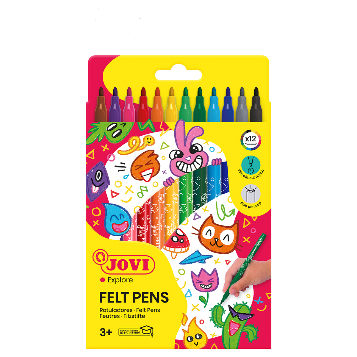Набор фломастеров JOVI с особо прочным наконечником и вентилируемым колпачком. Толщина линии письма - 3 мм, а длина линии письма составляет 400 метров. В наборе 12 ярких цветов: жёлтый, красный, чёрный, коричневый, синий, зелёный, серый, розовый, голубой, фиолетовый, светло-зелёный, оранжевый. <br/>Фломастеры представлены с коническим наконечником. Пластиковый корпус трехгранной формы с треугольной формой захвата, которая тренирует навык правильного захвата и снижает нагрузку на кисти рук. Полностью безопасные чернила на водной основе с пищевыми красителями. Фломастеры не высыхают без колпачка в течение 96 часов. Специальные вентилируемые колпачки обеспечивают прохождение воздуха при случайном проглатывании. Фломастеры JOVI легко смываются с кожи и отстирываются с большинства видов тканей. Упакованы в картонную коробку с европодвесом. <br/>• Количество цветов: 12;<br/>• Тип наконечника: конический;<br/>• Длина линии письма: 400 метров.