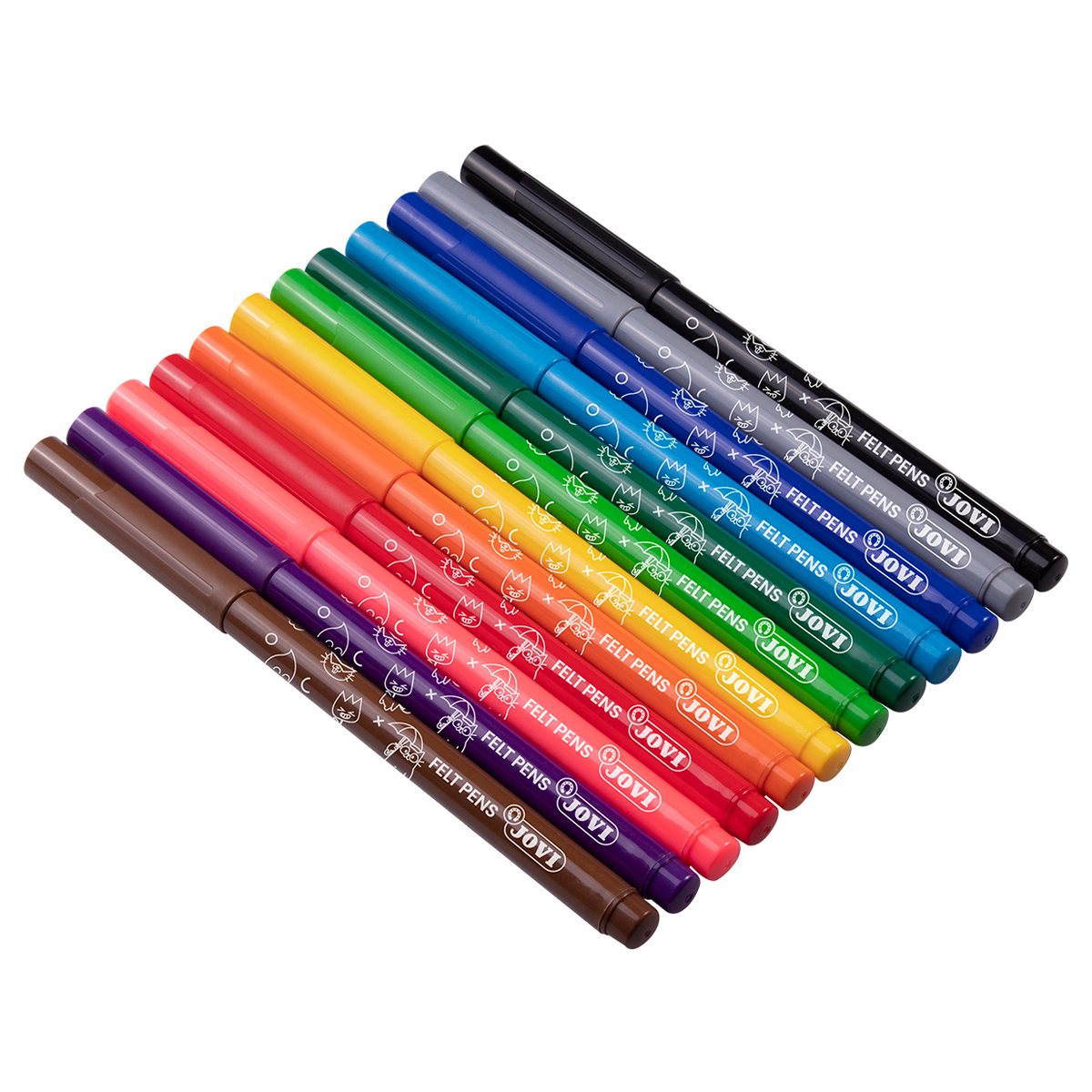 Набор фломастеров JOVI с особо прочным наконечником и вентилируемым колпачком. Толщина линии письма - 3 мм, а длина линии письма составляет 400 метров. В наборе 12 ярких цветов: жёлтый, красный, чёрный, коричневый, синий, зелёный, серый, розовый, голубой, фиолетовый, светло-зелёный, оранжевый.