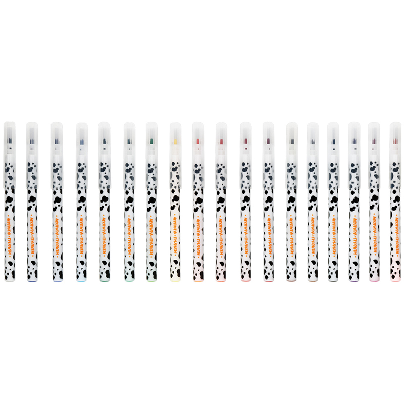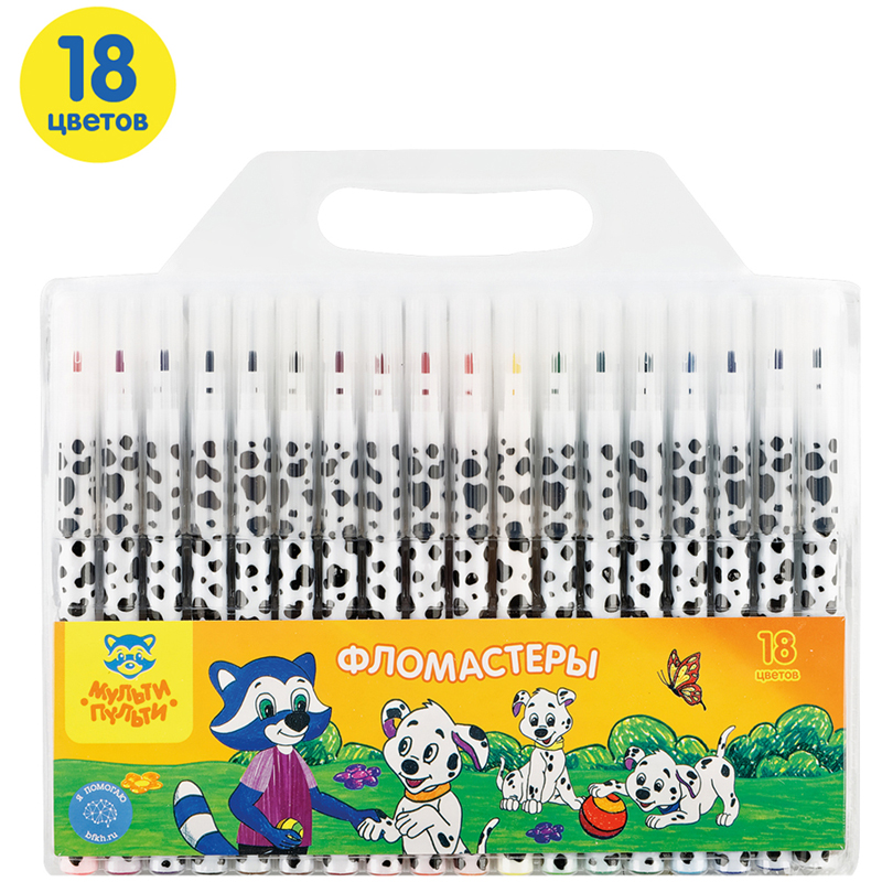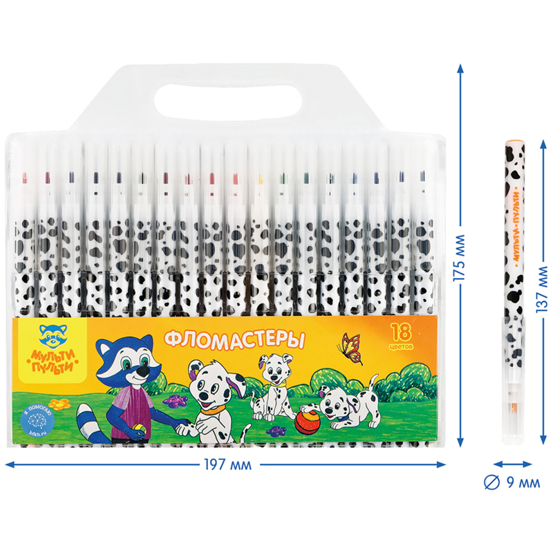 Фломастеры «Мульти-Пульти» серии «Енот и далматинцы» представлены с легкосмываемыми чернилами и вентилируемым колпачком. Толщина линии письма составляет 2 мм, а длина линии письма – не менее 310 метров. В наборе 18 ярких цветов. Корпус круглой формы изготовлен из пластика и имеет удобную круглую форму захвата. На белых корпусах фломастеров нанесен оригинальный рисунок, который привлекает дополнительное внимание к продукции. Тип наконечника – конический. Фломастеры сохраняют стабильный цвет при письме на протяжении всего использования. Смываемые фломастеры на водной основе нетоксичны. Набор фломастеров упакован в блистер с европодвесом.