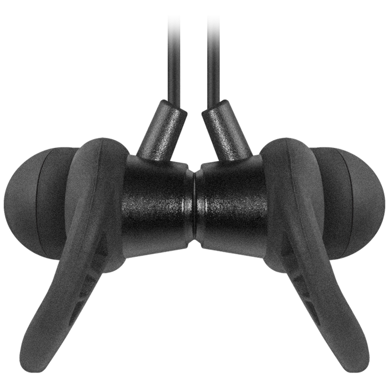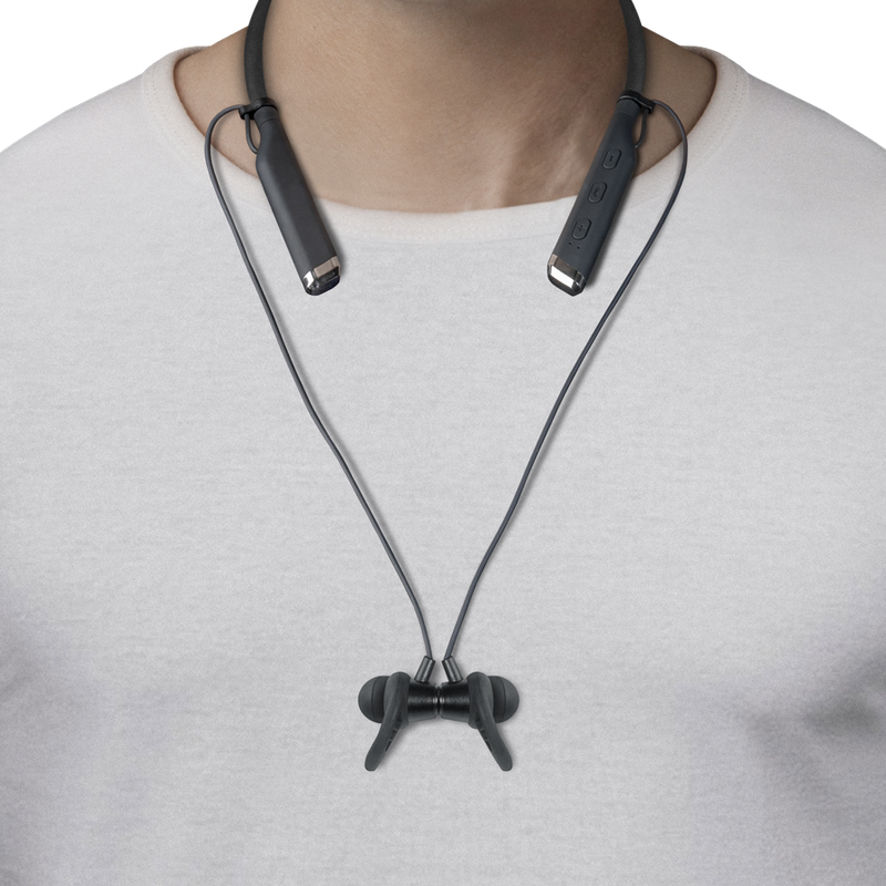 Портативная стерео гарнитура идеальна для занятий спортом - она небольшая, легкая и отлично держится на голове во время активного отдыха. Гибкий шейный обод. Слот для карты MicroSD. <br/>Встроенный микрофон обеспечивает качественную передачу звука. Три пары сменных амбушюр разного размера (S, M, L) позволят выбрать подходящий вам вариант, обеспечив максимальную звукоизоляцию и комфорт. Дополнительные С-образные фиксаторы для идеальной посадки. Благодаря встроенным магнитам наушники можно соединить между собой и оставить на шее, когда вы ими не пользуетесь. Время работы аккумулятора до 5 часов. Микрофон и клавиши управления на шейном ободе