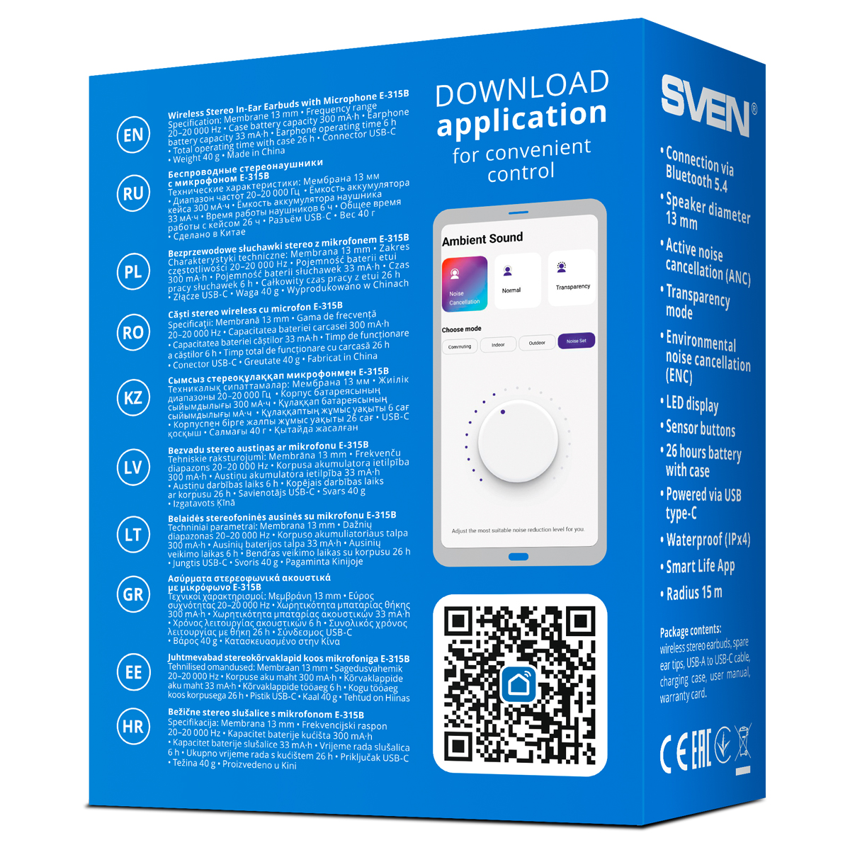 С первого взгляда становится ясно, что перед нами максимально «заряженное» устройство, у которого есть абсолютно все — даже собственный LED-дисплей с индикацией заряда на лицевой стороне кейса. Дизайн при этом выдержан в максимально строгом и лаконичном стиле, что позволит наушникам органично сочетаться с любым стилем одежды.<br/>Один из главных признаков по-настоящему флагманских наушников – это, конечно, наличие приложения для мобильных гаджетов, которое дает доступ ко всем параметрам и настройкам. SVEN E-315B поддерживают управление через ПО Smart Life, предлагаемое в версиях для устройств под управлением iOS и Android. С его помощью можно полностью управлять гарнитурой, используя удобный и понятный интерфейс – все настройки всегда под рукой в смартфоне пользователя.<br/>В частности, с помощью Smart Life можно настроить звучание под свой вкус и настроение с помощью встроенного эквалайзера, управлять воспроизведением музыки, выбирать режимы шумоподавления, а также включать «игровой режим», помогающий снизить задержку, добиться идеальной синхронизации изображения и звука как в играх, так и при просмотре видео. Отдельного упоминания заслуживает функция поиска, которая может выручить владельцев SVEN E-315B в сложной ситуации. Найти потерянные где-то в помещении наушники можно с помощью воспроизводимого ими высокочастотного сигнала, который хорошо слышен. Ну а если наушники забыты где-то вне дома, поможет возможность отображения их последнего положения на карте.<br/>Форма наушников обеспечивает максимально комфортное ношение. При этом, на удобстве сделан особый акцент — сенсорные кнопки управления поддерживают не только управление воспроизведением, но и регулирование громкости. Подумали разработчики и о тех пользователях, которые привыкли слушать музыку во время разного рода активностей — наушники защищены от водяных брызг и капель пота (IPx4), а потому могут использоваться даже на самой тяжелой тренировке или пробежке под легким дождем.<br/>Подключение гарнитуры к другим гаджетам осуществляется с помощью современного Bluetooth 5.4, а за звук в них отвечают крупные динамики диаметром 13 мм — такое редко встречается даже в самых передовых на сегодняшний день решениях. Они позволяют наушникам выдавать звук премиального уровня и обеспечивать качественное звучание в широком частотном диапазоне, в том числе — воспроизводить плотный и яркий бас.<br/>Максимальное погружение в воспроизводимый материал обеспечивает система активного шумоподавления (ANC) с несколькими режимами работы, позволяющими комфортно слушать музыку или подкасты на средней громкости как посреди большого офиса, так и в шумном общественном транспорте. Контролировать происходящее вокруг, быстро пообщаться с кем-нибудь или услышать нужную информацию поможет режим «звуковой прозрачности», в котором микрофоны гарнитуры транслируют окружающие звуки в динамики. У микрофонов есть собственная система шумоподавления (ENC), которая позволит без проблем общаться по телефону и записывать голосовые сообщения даже в шумной обстановке.<br/>Встроенные аккумуляторы внутриканальных наушников позволяют им работать до 6 часов от одного заряда — хватит и на тренировку, и на дорогу на работу. При этом периодическая подзарядка от кейса позволяет достичь общей автономности до 26 часов — часто заряжать