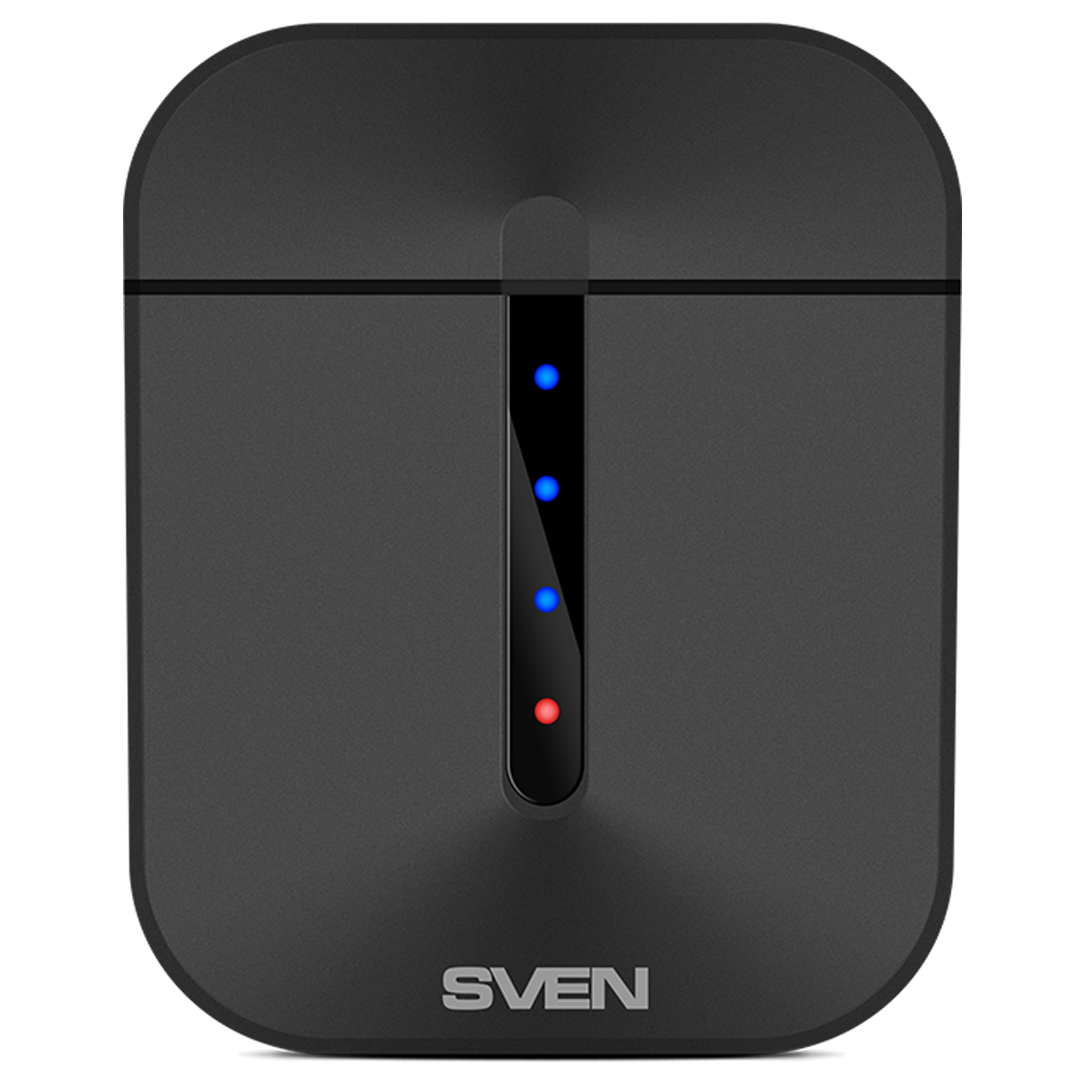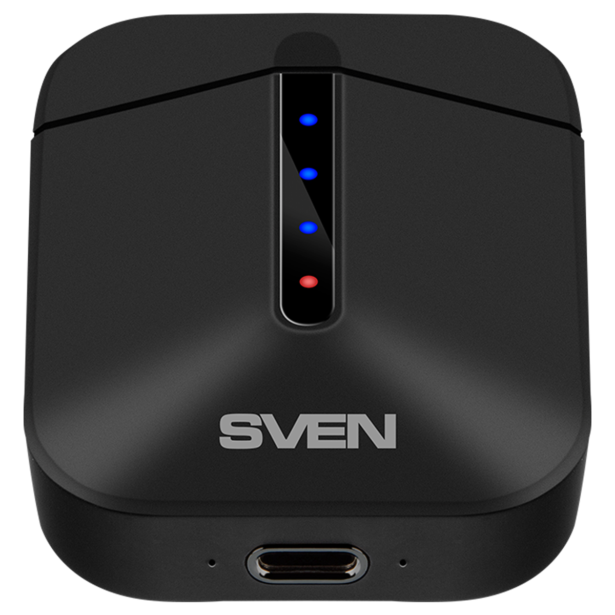 Первым обращает на себя внимание кейс для хранения и зарядки наушников. Отделка с софт-тач покрытием, светодиодные индикаторы на передней панели и оригинальная форма корпуса напоминают лучшие из премиальных продуктов, несмотря на то, SVEN E-335B предлагается по доступной для широкого круга покупателей цене. При этом кейс не очень большой и легко поместится в карман, зарядка осуществляется через самый распространенный на сегодняшний день порт USB Type C — комфорту использования уделено ничуть не меньше внимания, чем внешнему виду.