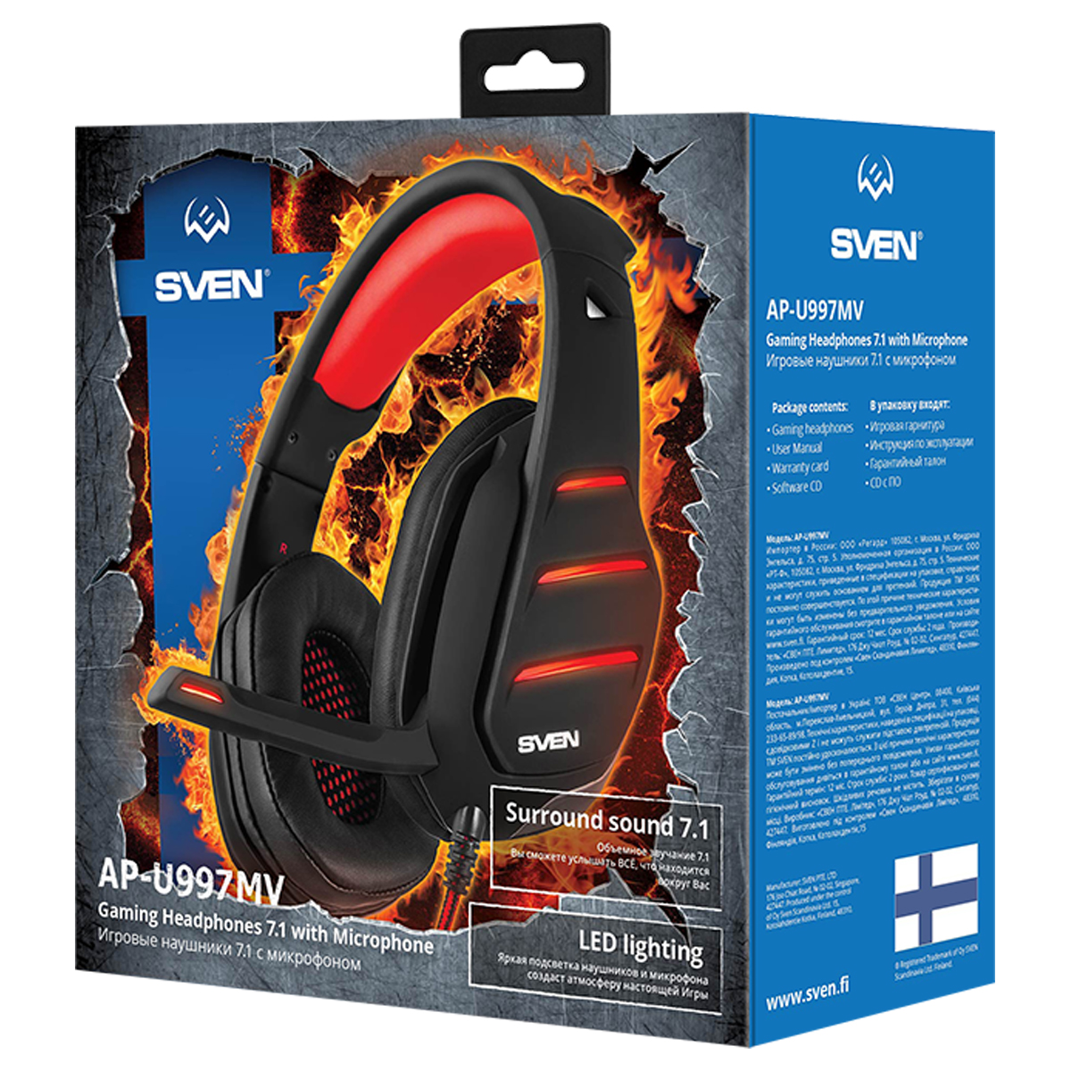 Компания SVEN спешит порадовать профессиональных геймеров очередной классной моделью - гарнитурой AP-U997MV с объемным звучанием 7.1.<br/><br/>Счастливый обладатель этой модели получит эргономичную гарнитуру, выполненную из качественного пластика с покрытием Soft touch, с мягким оголовьем и удобными амбушюрами. Сочетание черного и красного, металлические вставки на чашках и оголовье придают гарнитуре воинственный и брутальный вид. При желании можно включить подсветку чашек и микрофона. Сделать это очень легко с помощью удобного пульта, расположенного на кабеле в тканевой оплетке. На пульте также находятся кнопки включения и выключения микрофона, регулировки громкости.<br/><br/>С помощью входящего в комплект программного обеспечения вы можете индивидуально настроить звук SVEN AP-U997MV. Высочайшее качество звучания этой гарнитуры позволяет вовремя заметить соперника, понять, где он прячется, и отразить его атаку. При этом крупные мягкие амбушюры наушников не пропускают посторонних шумов и позволяют полностью сосредоточиться на игре.
