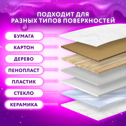 Гель-клей подходит для использования с различными типами поверхности: бумага, картон, дерево, пенопласт, пластик, стекло, керамика.