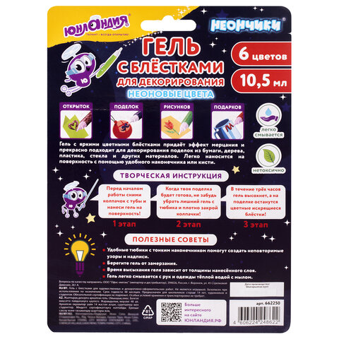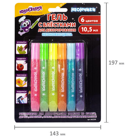 Гель с блёстками ЮНЛАНДИЯ "НЕОНЧИКИ" - это блестящие наборы для творчества и украшения открыток, поделок, рисунков и подарков. Удобный наконечник с дозатором позволяет легко наносить гель на любую поверхность.