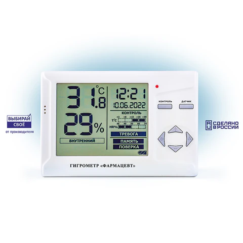 Гигрометр служит надежным инструментом контроля температуры и влажности в процессах производственного контроля и облегчает работу ответственных специалистов при соблюдения требований установленных Приказами Росздравнадзора №646н, №706н, №9438, условий хранения и транспортировки лекарственных средств, вакцин и термолабильных лекарственных средств, микроклимата помещений лечебных учреждений, СанПин 2.1.3678-20, стандартов GPP и GDP.