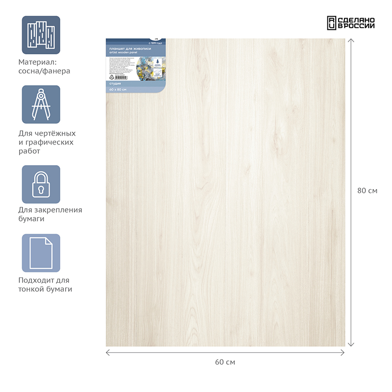 Планшеты из фанеры представляют собой жесткую основу для закрепления бумаги для чертежных и графических работ, выездов на пленэры. Планшет может быть закреплен на мольберте или этюднике. Планшет представляет собой лист клееной березовой фанеры первого сорта, закрепленный на жестком сосновом подрамнике. Фанера хорошо отшлифована, подходит даже для тонкой бумаги. Для закрепления бумаги можно использовать кнопки, поверхность планшета достатчоно мягкая для надежной фиксации, практически не повреждается и подходит для длительной эксплуатации. Планки подрамника надежно соединены металлическими скобами, фанера крепится к подрамнику под давлением, чтобы обеспечить мгновенную и прочную склейку.