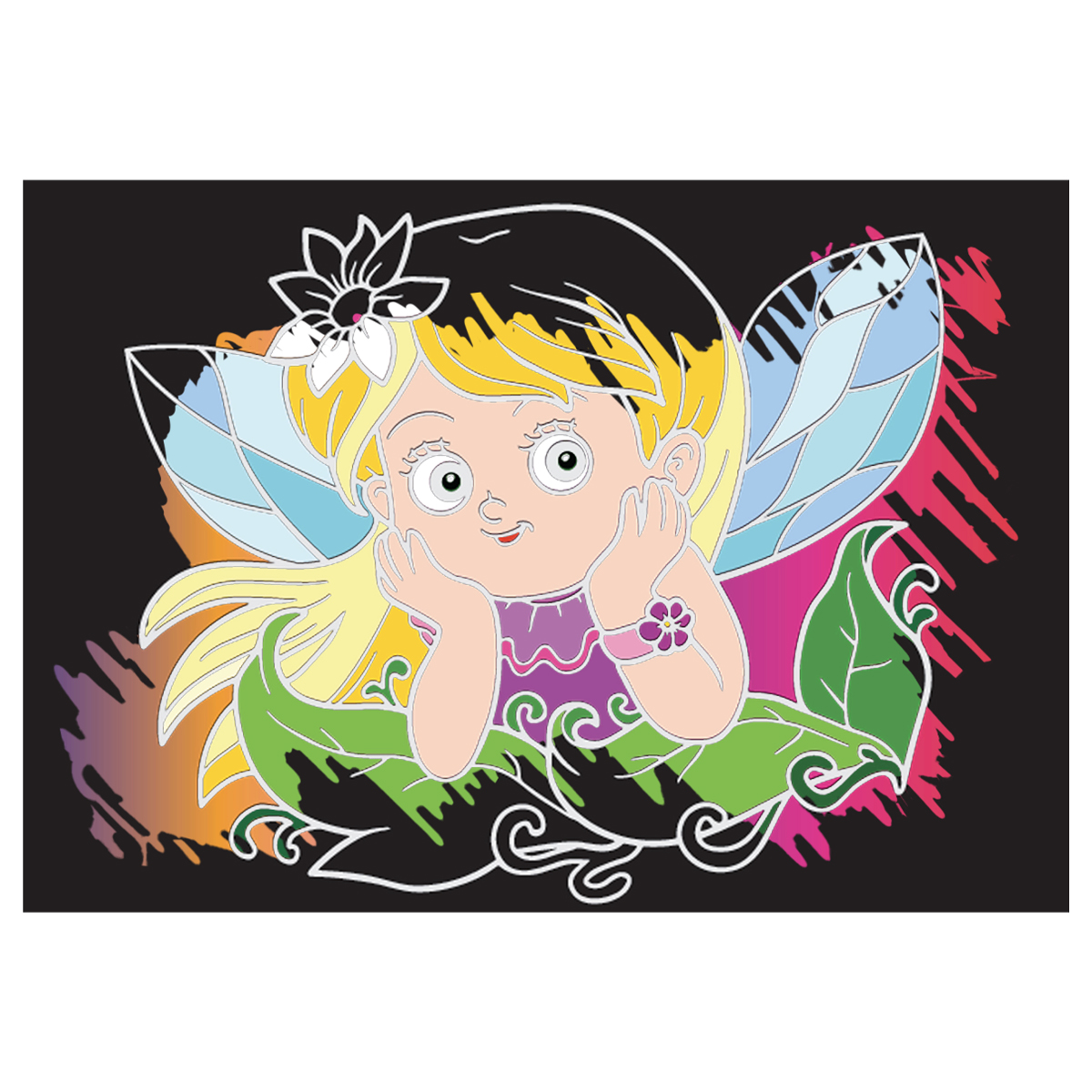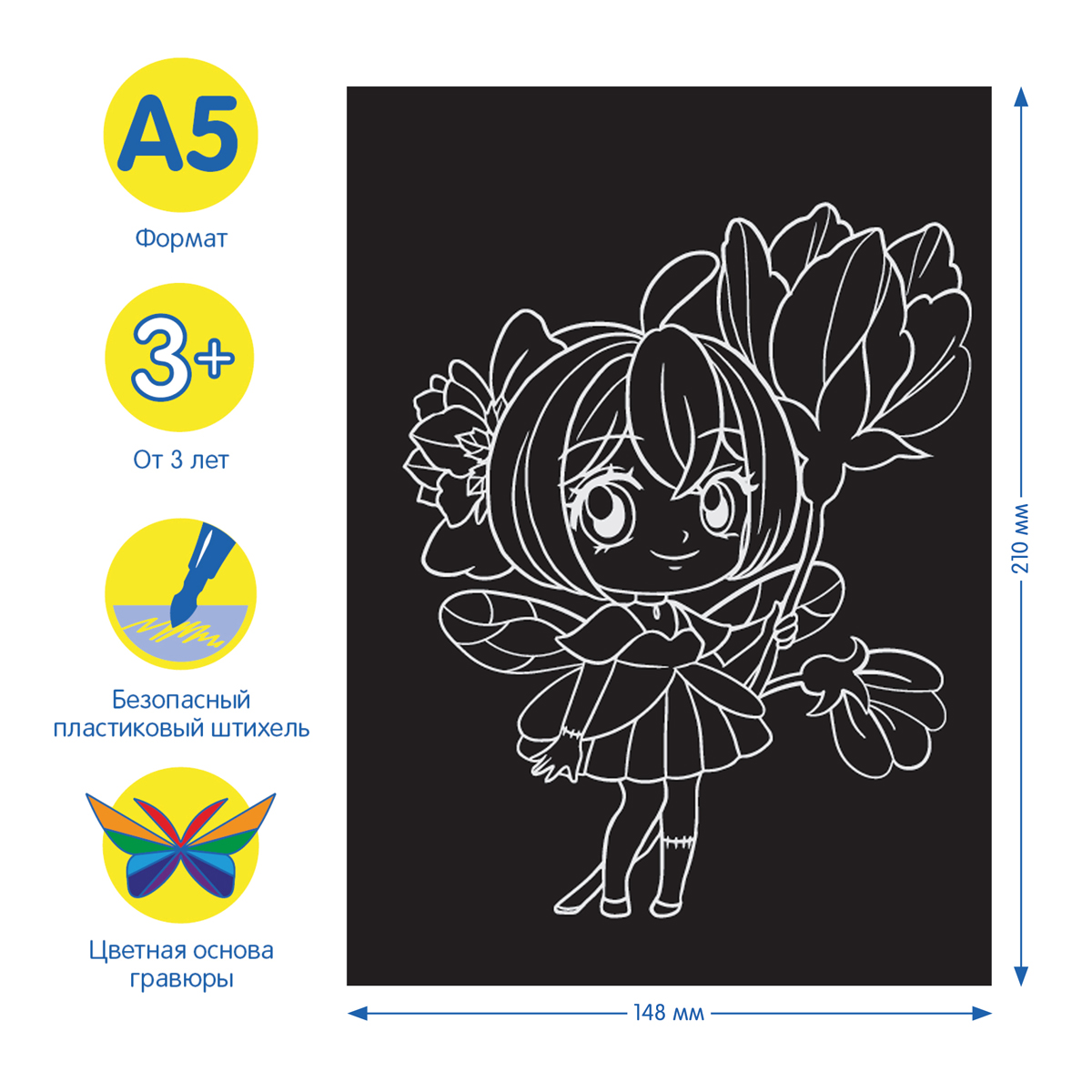 Гравюра – прекрасное средство развития воображения, аккуратности и терпения, а также мелкой моторики рук. Ребёнку понравится создавать яркую картинку с помощью безопасного инструмента. Набор может стать превосходным подарком. Гравюра предназначена для детей старше трех лет.<br/>В набор входят «Мульти-Пульти»:<br/>1. Основа – заготовка с нанесенным контуром. Она представляет собой яркую картинку, покрытую слоем чёрного цвета. В комплекте идет 2 основы с различным рисунком.<br/>2. Специальный штихель – безопасный для малыша пластмассовый инструмент.<br/>Набор «Феи» идеально подходит для первого опыта гравирования. Если с нажимом провести штихелем по листу картона, то чёрный слой легко снимется и под ним проступит яркий рисунок. Штриховать картинку можно, как обозначая отдельные детали и героев рисунка, так и всю целиком. Кроме того, комплект упакован в картонный конверт с европодвесом.<br/>• Размер: А5;<br/>• Тематика: феи;<br/>• Эффект: разноцветная основа.