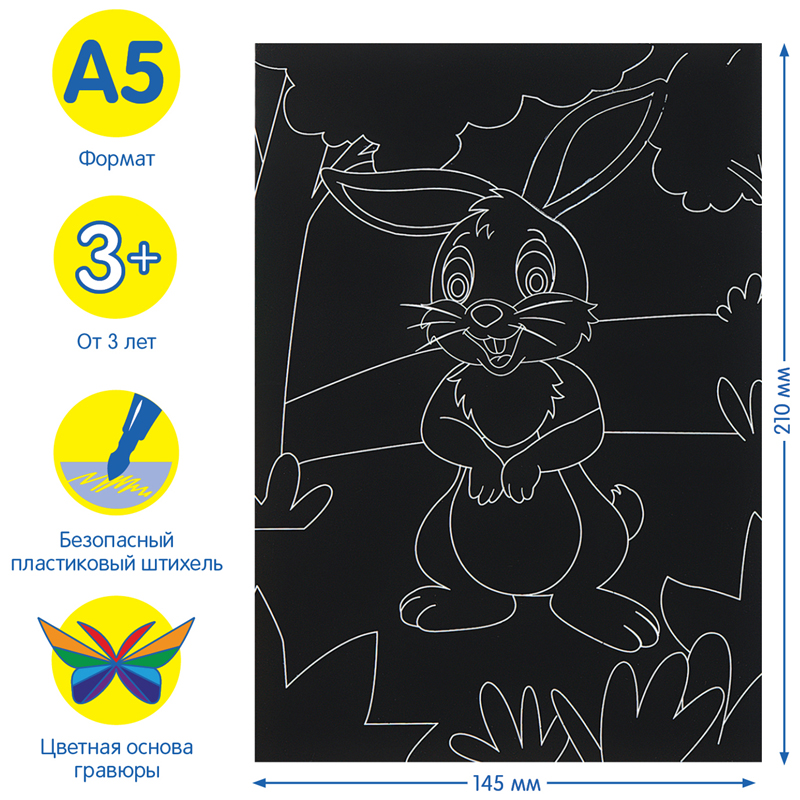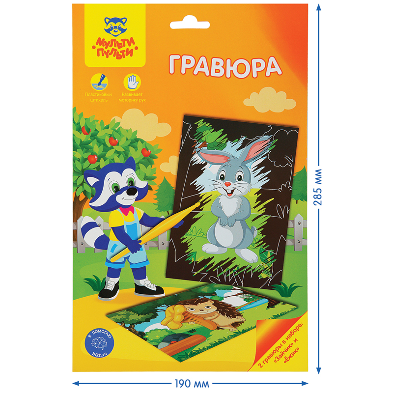Гравюра – прекрасное средство развития воображения, аккуратности и терпения, а также мелкой моторики рук. Ребенку понравится создавать яркую картинку с помощью безопасного инструмента. Набор может стать превосходным подарком. Гравюра предназначена для детей старше трёх лет. <br/>В набор входят: <br/>1. Основа – заготовка с нанесённым контуром. Она представляет собой яркую картинку, покрытую слоем чёрного цвета. В комплекте идёт 2 основы с различным рисунком.<br/>2. Специальный штихель – безопасный для малыша пластмассовый инструмент. <br/>Набор идеально подходит для первого опыта гравирования. Если с нажимом провести штихелем по листу картона, то черный слой легко снимется и под ним проступит яркий рисунок. Штриховать картинку можно, как обозначая отдельные детали и героев рисунка, так и всю целиком. Кроме того, комплект упакован в картонный конверт с европодвесом.<br/>• Основа: картон;<br/>• Вид товара: гравюра;<br/>• Тематика: животные;<br/>• Размер: А5;<br/>• Возраст: от 3 лет;<br/>• Пол: универсальный.
