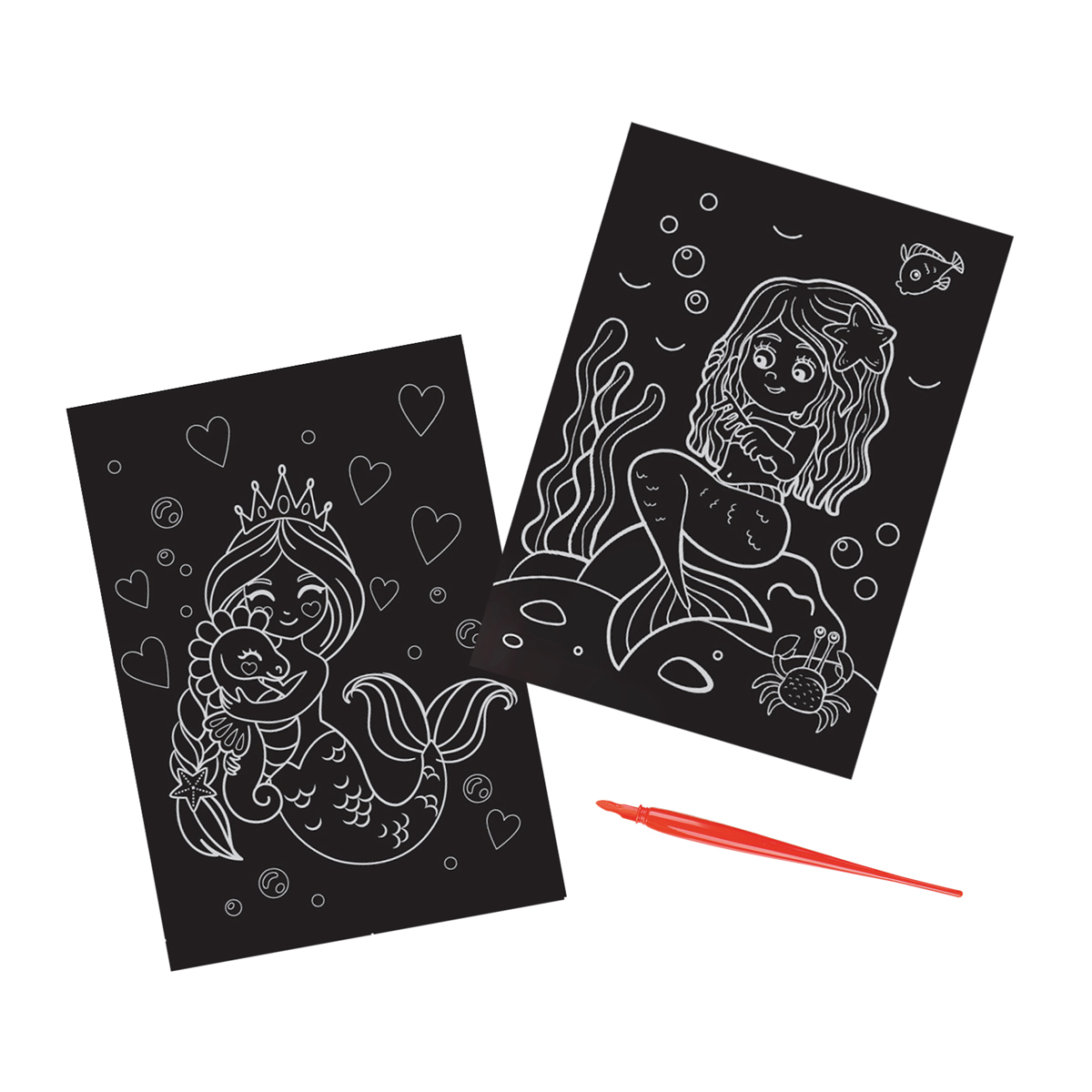 Набор «Русалки» идеально подходит для первого опыта гравирования. Если с нажимом провести штихелем по листу картона, то чёрный слой легко снимется и под ним проступит яркий рисунок. Штриховать картинку можно, как обозначая отдельные детали и героев рисунка, так и всю целиком. Кроме того, комплект упакован в картонный конверт с европодвесом.