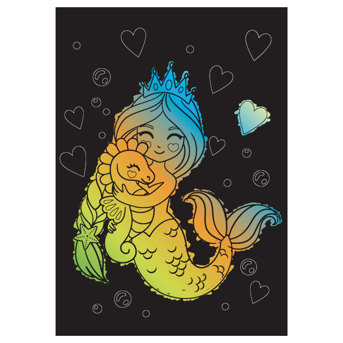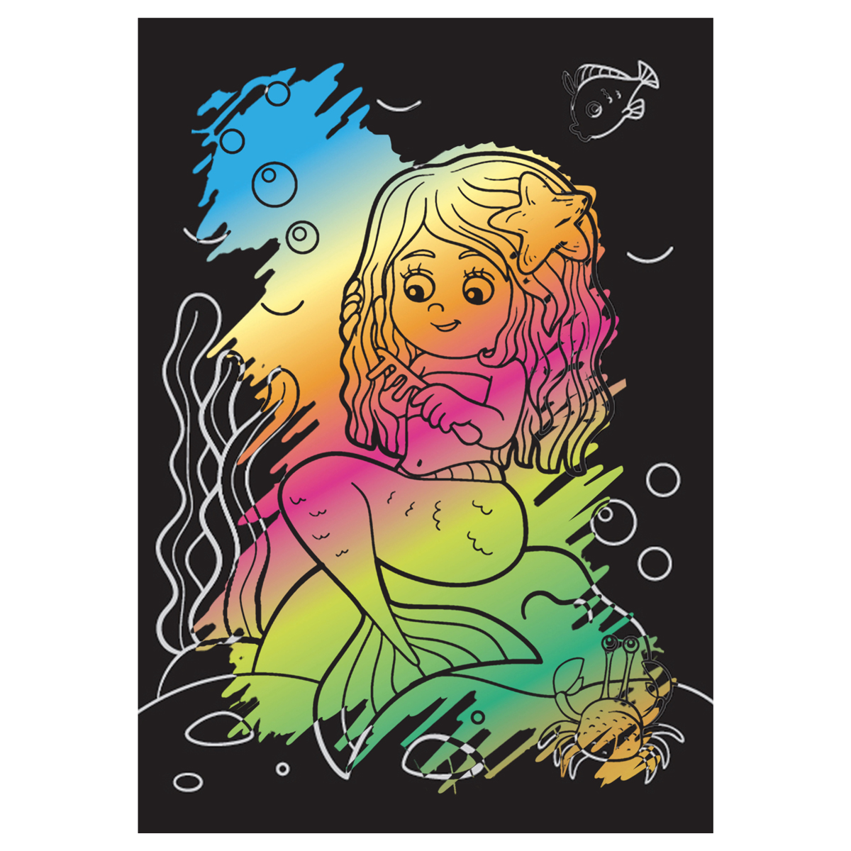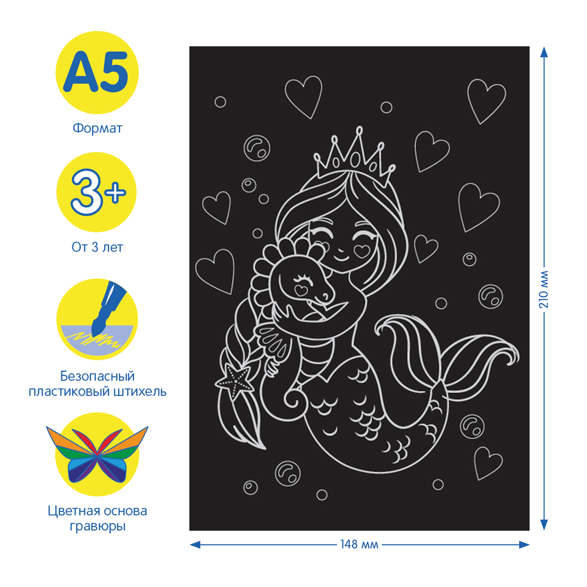 Гравюра – прекрасное средство развития воображения, аккуратности и терпения, а также мелкой моторики рук. Ребёнку понравится создавать яркую картинку с помощью безопасного инструмента. Набор может стать превосходным подарком. Гравюра предназначена для детей старше трех лет.<br/>В набор входят «Мульти-Пульти»:<br/>1. Основа – заготовка с нанесенным контуром. Она представляет собой яркую картинку, покрытую слоем чёрного цвета. В комплекте идет 2 основы с различным рисунком.<br/>2. Специальный штихель – безопасный для малыша пластмассовый инструмент.<br/>Набор «Русалки» идеально подходит для первого опыта гравирования. Если с нажимом провести штихелем по листу картона, то чёрный слой легко снимется и под ним проступит яркий рисунок. Штриховать картинку можно, как обозначая отдельные детали и героев рисунка, так и всю целиком. Кроме того, комплект упакован в картонный конверт с европодвесом.<br/>• Размер: А5;<br/>• Тематика: русалки;<br/>• Эффект: градиент.