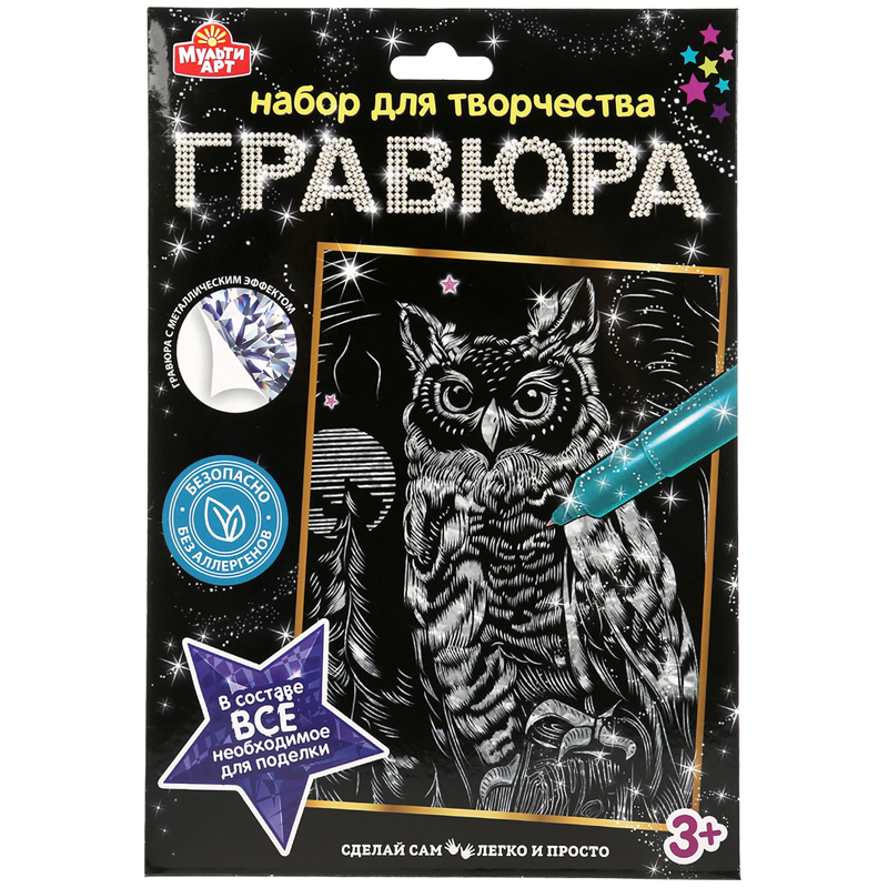 С помощью данного набора юный художник сможет создать эффектную серебристую картину на чёрном фоне. Контур рисунка уже нанесён на основу, остаётся только процарапать изображение специальным штихелем. Готовую поделку можно подарить близким или использовать для украшения интерьера.