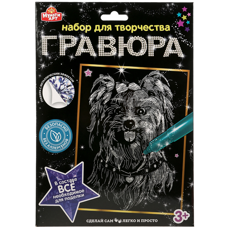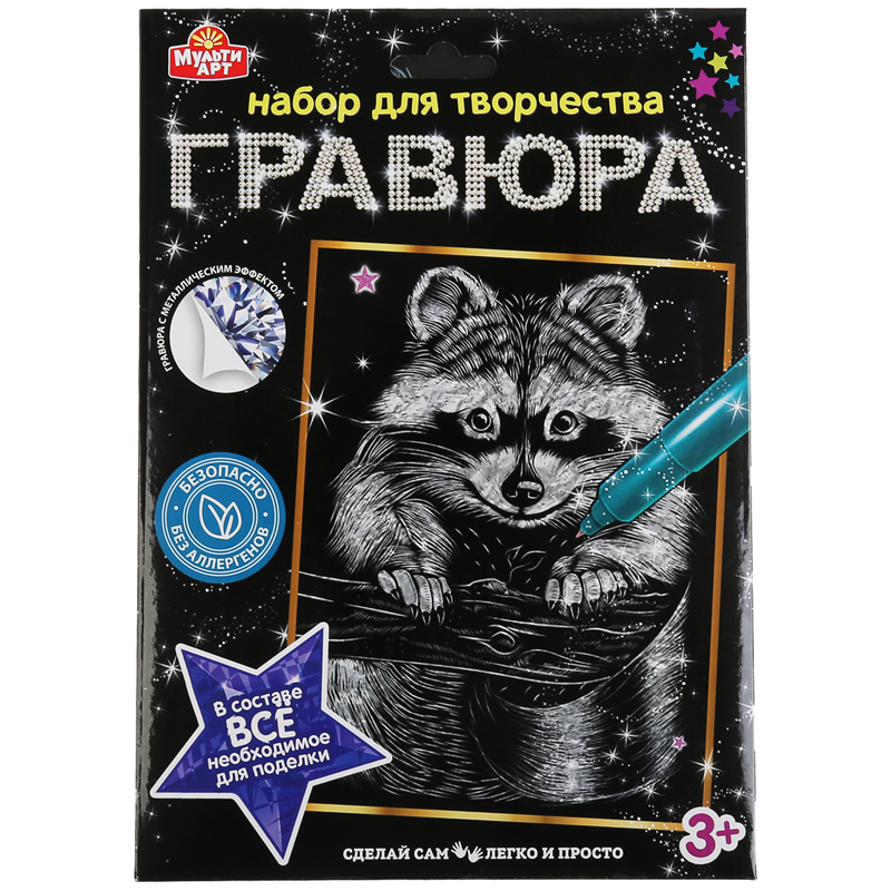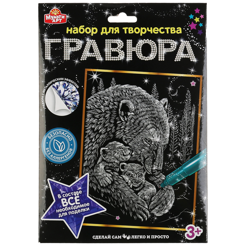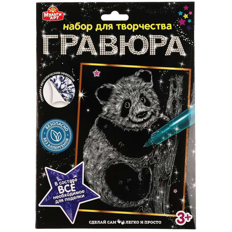Набор для творчества «Гравюра. ТМ «МультиАрт» - отличный подарок для ребёнка, который будет способствовать развитию его творческих способностей:<br/>- с металлическим эффектом («серебро»)<br/>- безопасно и гипоаллергенно<br/>- в составе всё необходимое для поделки: основа + штихель<br/>С помощью данного набора юный художник сможет создать эффектную серебристую картину на чёрном фоне. Контур рисунка уже нанесён на основу, остаётся только процарапать изображение специальным штихелем. Готовую поделку можно подарить близким или использовать для украшения интерьера.<br/>Занятия с наборами для творчества ТМ «МультиАрт» развивают:<br/>- внимание и усидчивость<br/>- творческое мышление<br/>- моторику рук<br/>- воображение<br/>Размер: 18 х 24 см. Материал: картон + пластмасса.<br/>Рекомендовано детям от 3-х лет.