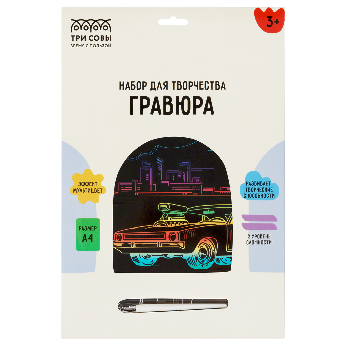 Гравюра с мультицветной основой «ТРИ СОВЫ» «Городской гонщик»— занимательный, увлекательный и несложный для ребенка вид творчества, который научит аккуратности и усидчивости. Состав набора: основа формата А4(21*29,7 см) из картона, штихель, крепление на стену. Гравюра понравится мальчикам.<br/>Работа над гравюрой развивает не только внимательность, но и мелкую моторику рук, что способствует формированию красивого почерка. Создавая гравюру с транспортом, ребенок может добавлять на картинку новые элементы, штрихи и линии, не ограничивая свою фантазию и изобретая собственные сюжеты. Завершенная работа станет замечательным украшением интерьера или отличным подарком кому-то из близких.<br/>Набор упакован в картонный конверт с европодвесом.<br/>ВНИМАНИЕ! Товар не предназначен для детей в возрасте до 3-х лет. Набор содержит острый предмет. Использовать только под присмотром взрослых. <br/><br/>«ТРИ СОВЫ» – ВРЕМЯ С ПОЛЬЗОЙ!<br/><br/>• Размер: 21*29,7 см;<br/>• Эффект: мультицвет;<br/>• Пол: мужской; <br/>• Возраст: от 3 лет.